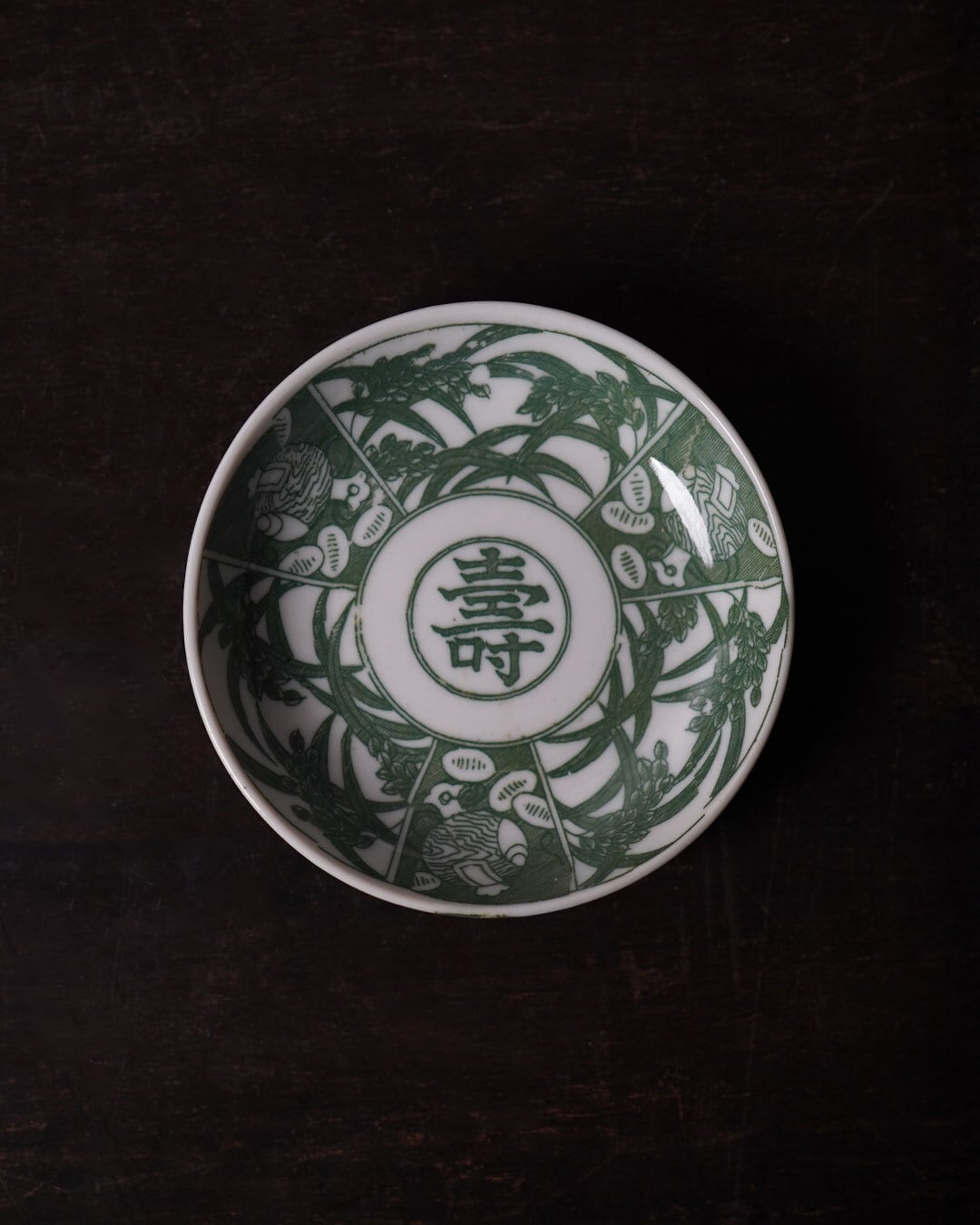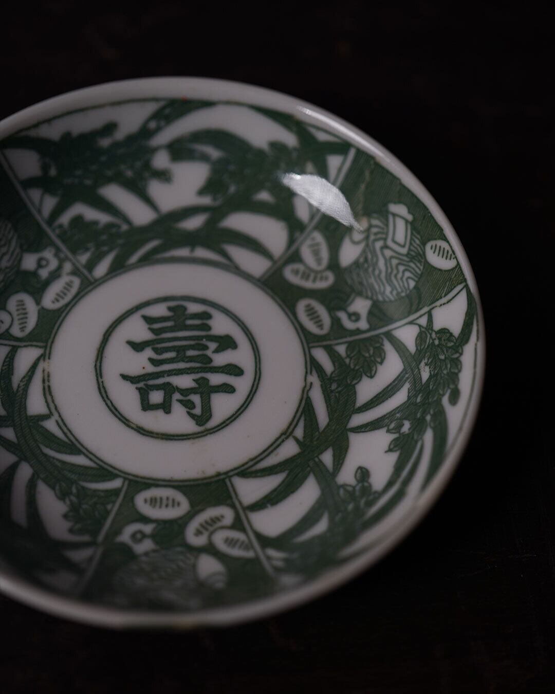 見込中央に「壽」の文字を配し、周囲には打ち出の小槌と稲穂の吉祥文様を巡らせた小皿です。明治から大正期頃のものと思われます。落ち着いた緑味が、100年の時代を経た器ならではの深みを感じさせます。