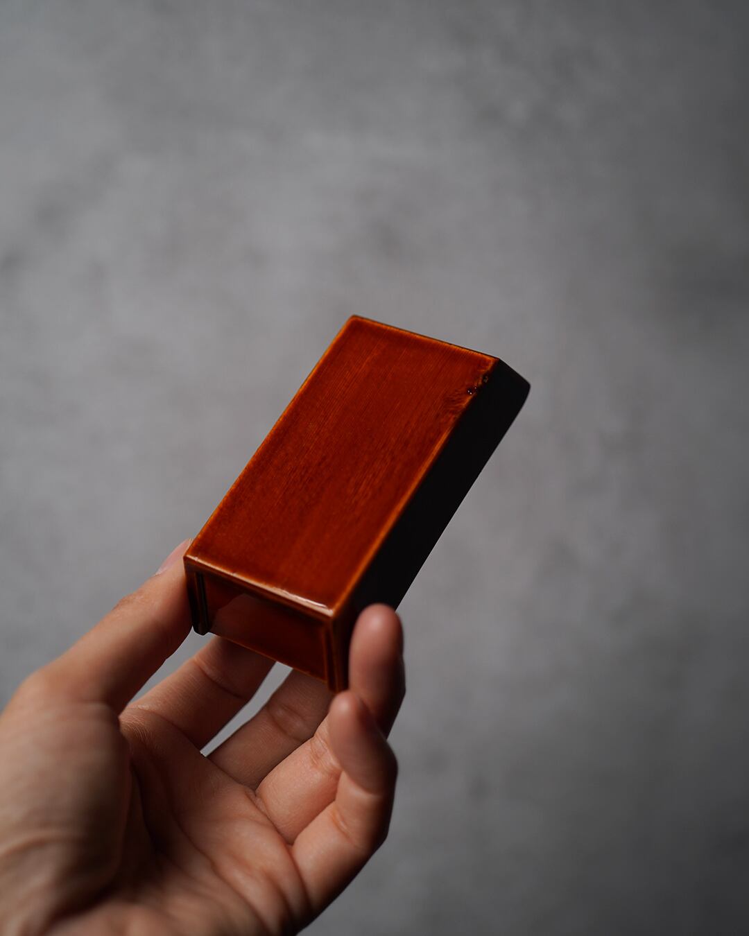 春慶塗は木地の木目を生かし、その上に透漆を幾重にも重ねることで、深みのある琥珀色を生み出す伝統技法。本作にも、木地の素直な木目がうっすらと透け、光の加減によって柔らかく表情を変えます。