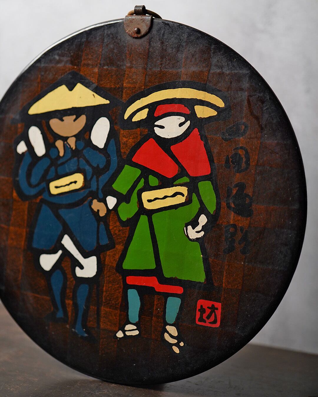 丸形の板に、和田邦坊によるお遍路さんの図が配された壁掛けです。