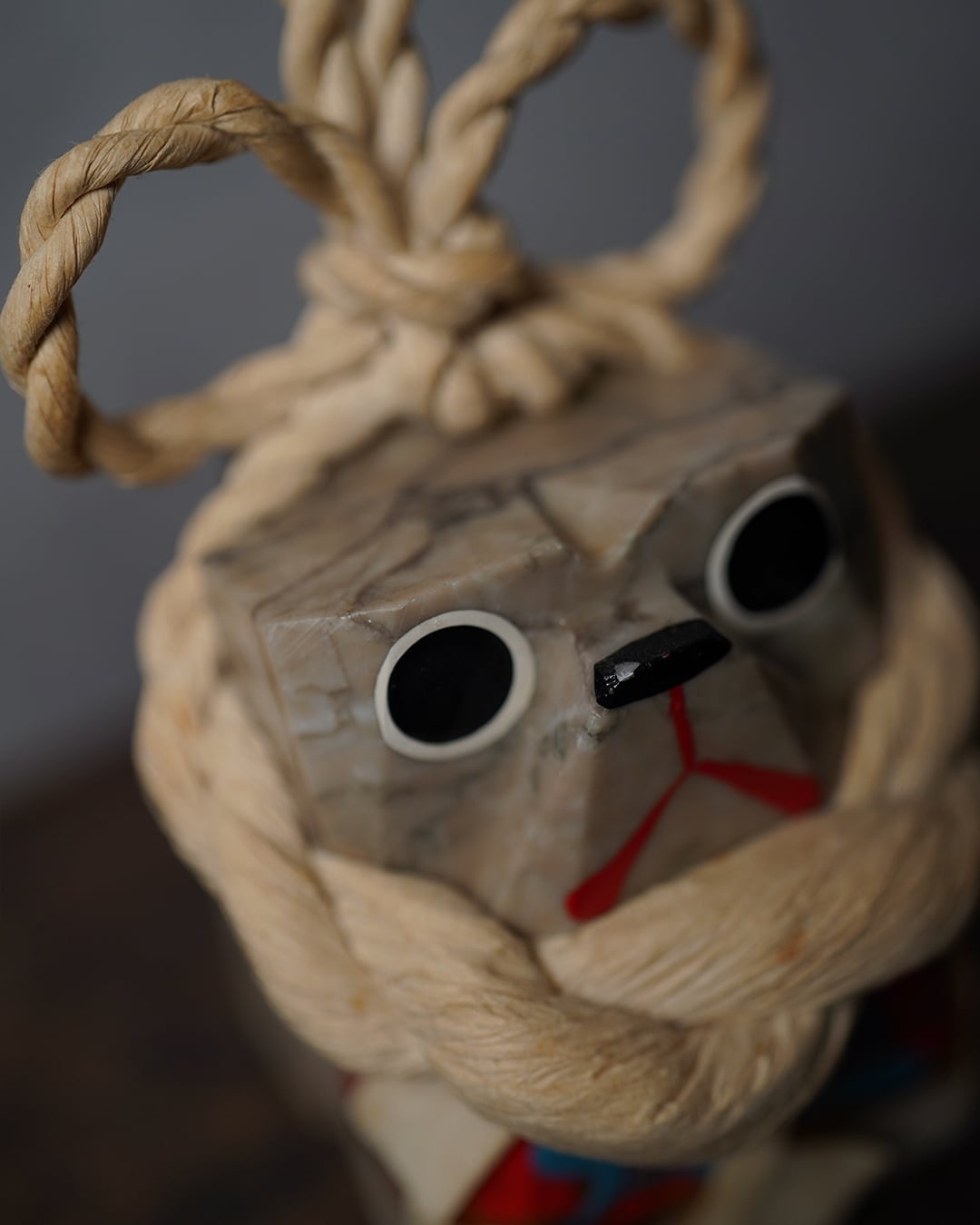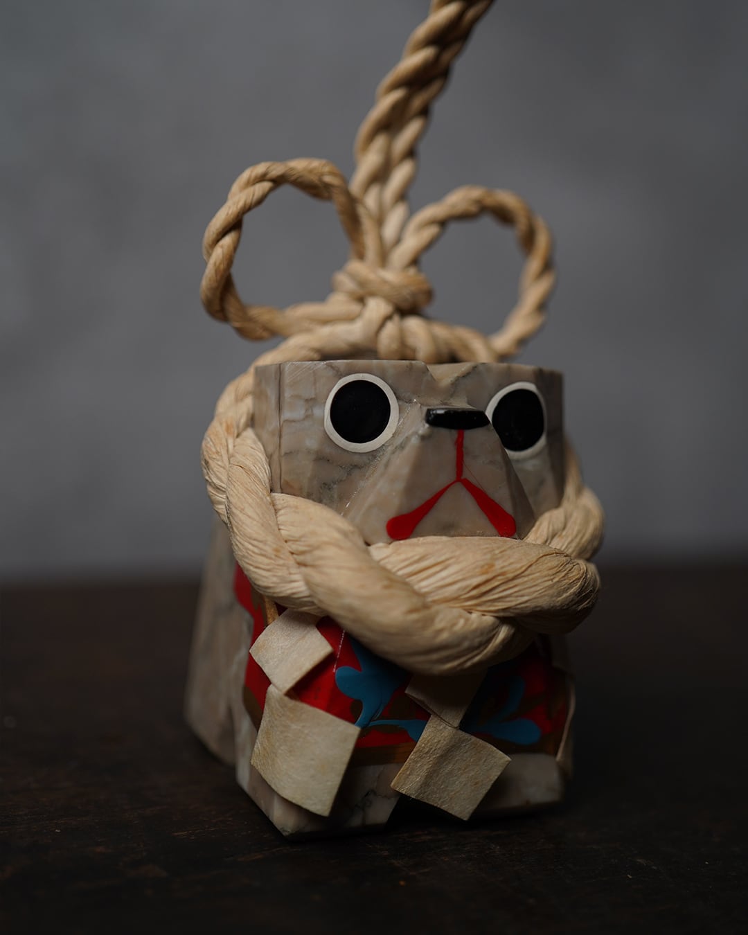 磨かれた大理石の質感に、闘犬の横綱のみが身につけることを許された立派なしめ縄を合わせることで、郷土性を感じさせながらもどこかモダンな佇まいに仕上がっています。力強さと愛嬌を併せ持つ表情は、民芸的な素朴さを超えた高いデザイン性を感じさせます。