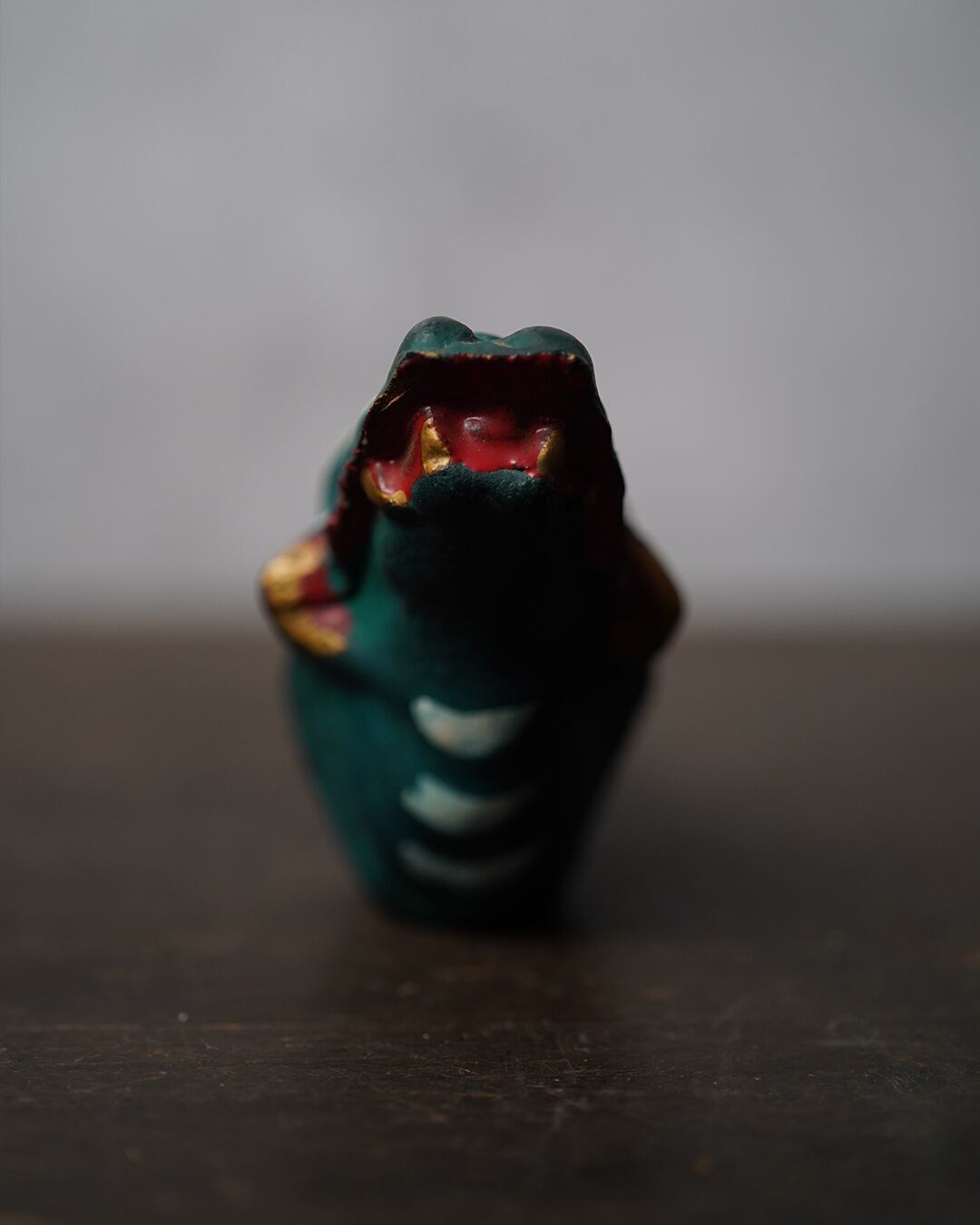 作風からは下河原焼か尾崎人形の土笛とも考えられますが、産地や系譜を断定できる資料はなく、詳細は定かではありません。ただ、深く沈んだ緑青の色味や、長い時間を経て現れた彩色の擦れ、土肌の落ち着いた表情からは、希少な古い時代の作であることが推測されます。