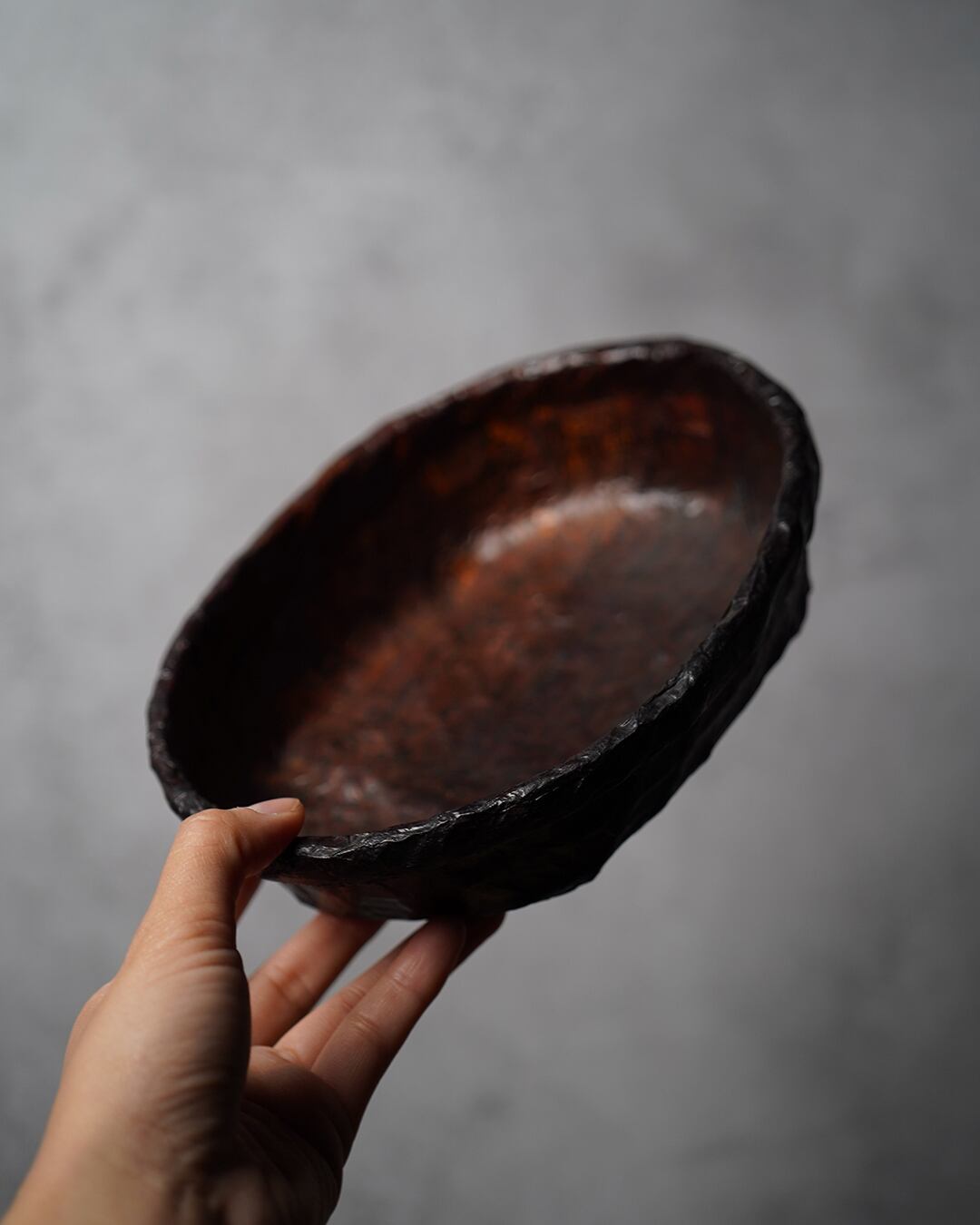 秘伝の柿渋を塗っては乾かす工程を数十回繰り返すことで、深みのある光沢と質感が生まれます。和紙には古書を用いるのも特徴で、時を重ねた素材が静かな渋みを添えています。
