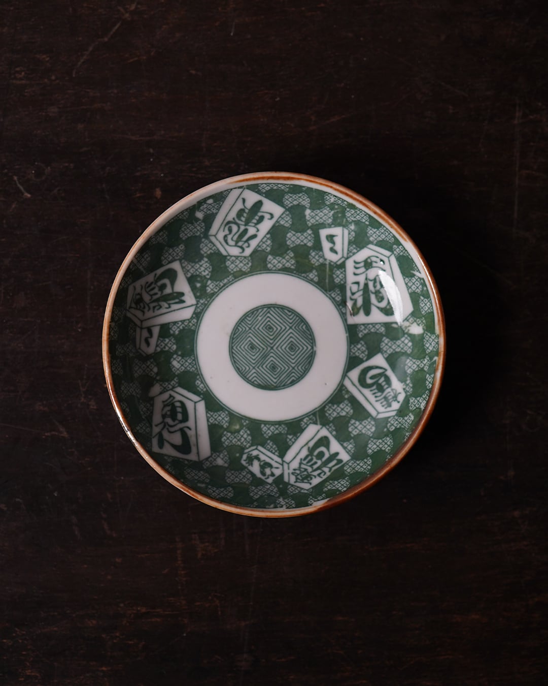 見込みいっぱいに将棋駒を散らした印判小皿です。