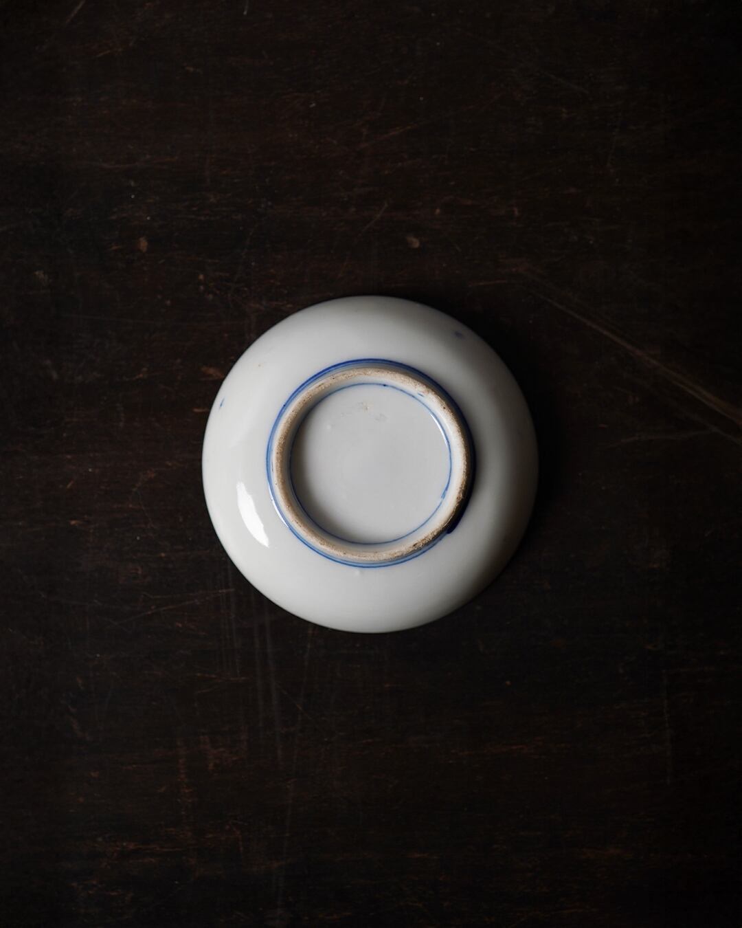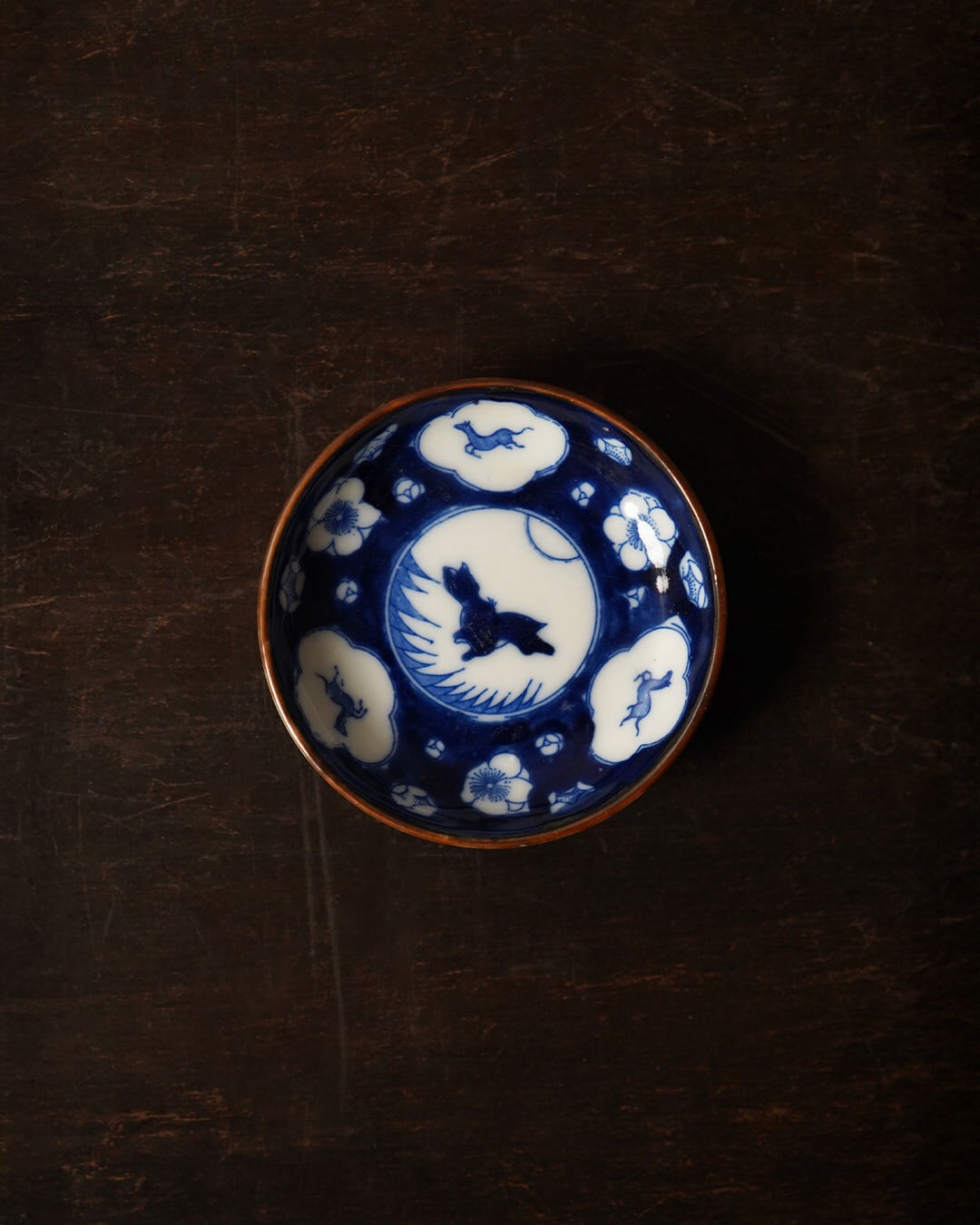 深い瑠璃色の地に白く抜いた月と兎が浮かび上がり、雲形の窓絵には馬、さらに梅花を散らした構成。静かな月夜の中に、ほのかな躍動が感じられます。銅版転写による印判の上から、手仕事で瑠璃を重ねた近代らしい技法も見どころです。口縁には茶縁がめぐり、全体をやわらかく引き締めています。