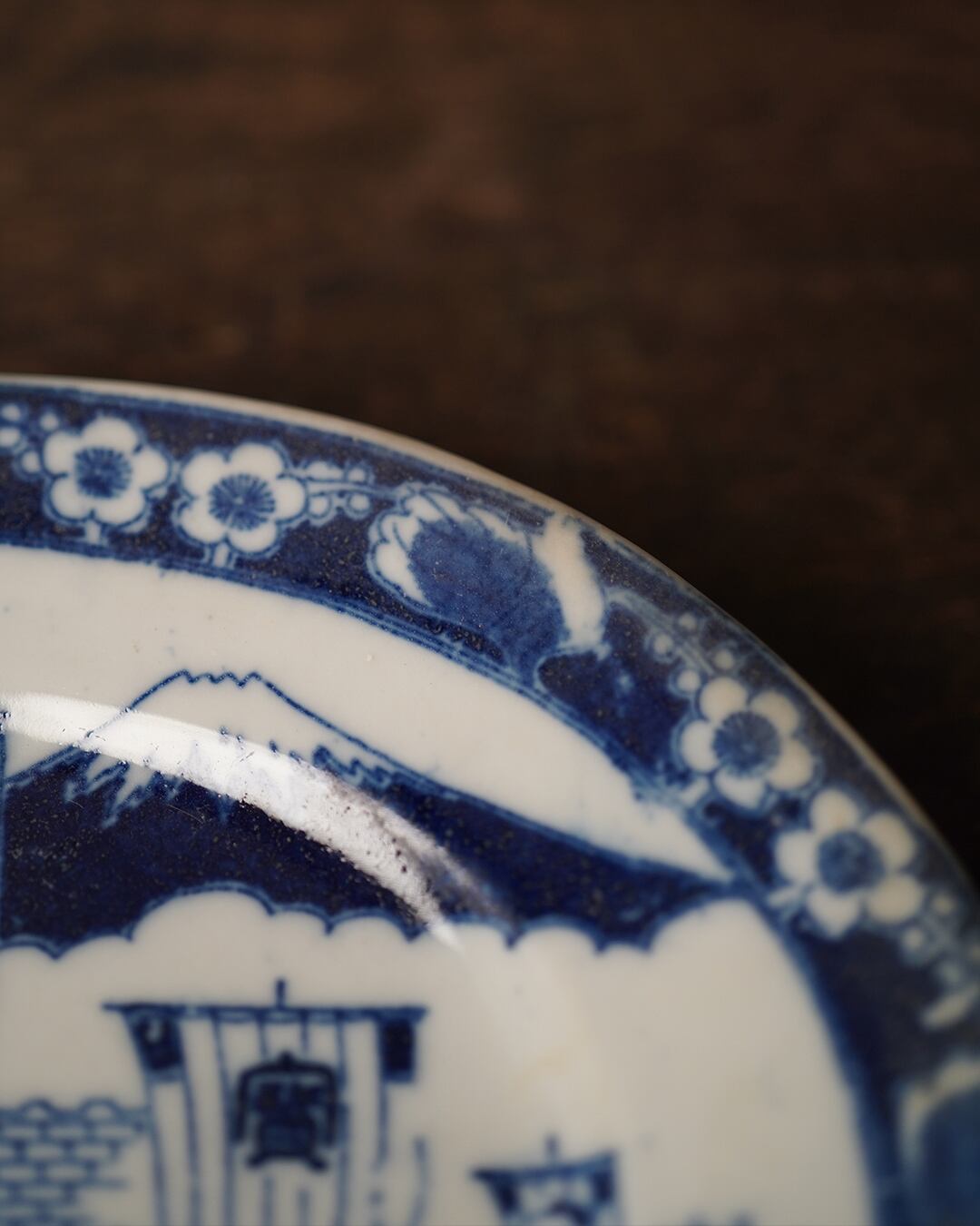 印判ならではの均整のとれた図柄。縁には花文をめぐらせ、濃い呉須の帯がまるで額縁のように中央の景色を引き立てています。楕円のかたちは横への広がりを強調し、富士の姿をいっそう印象的に見せます。