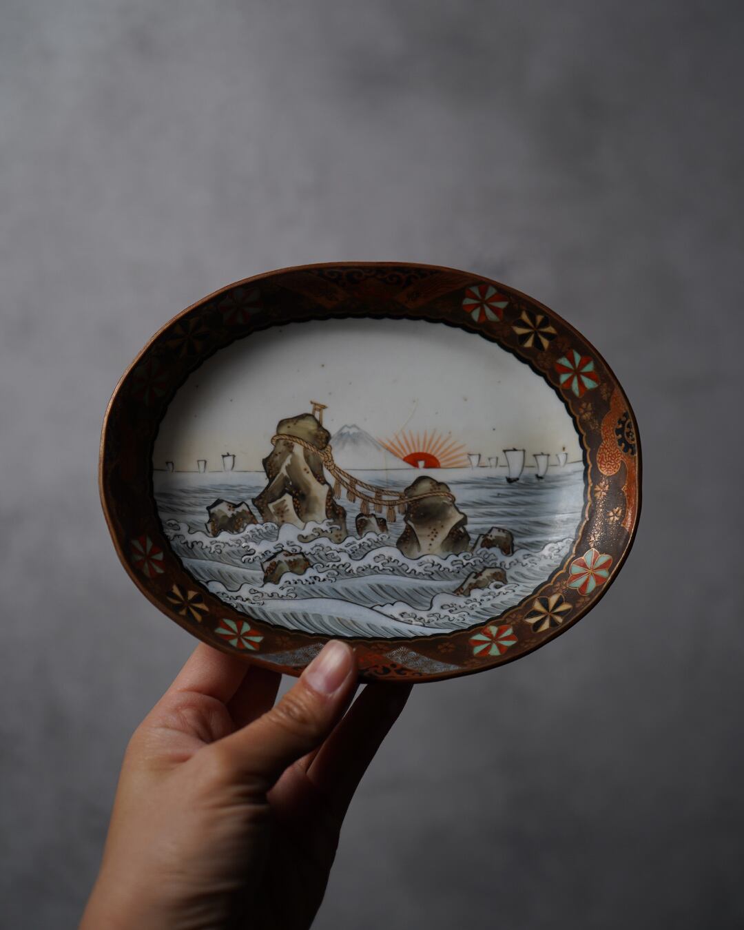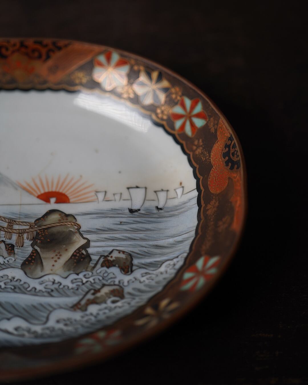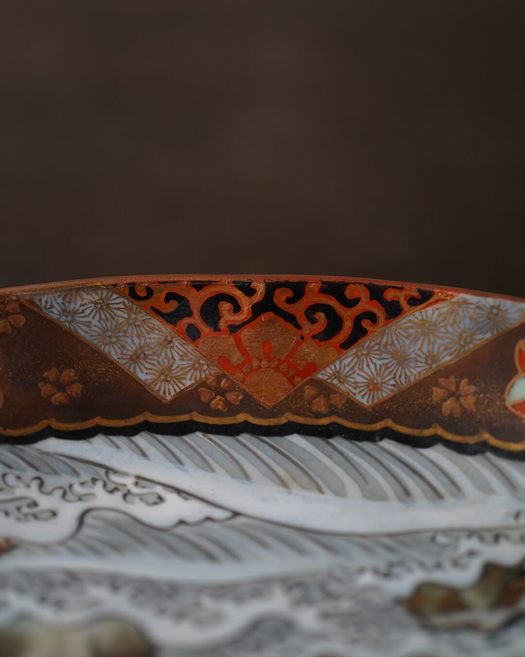波は墨の濃淡で躍動的に表され、岩肌には金彩を点描のように施し、光を受けてきらめく表情に。縁は褐色地を基調に赤と金を重ねた九谷らしい華やかな意匠。花文や唐草をめぐらせ、まるで額縁のように景色を引き立てます。細部にまで神経を行き届かせた筆致からは、当時の職人の確かな技と美意識が感じられます。
