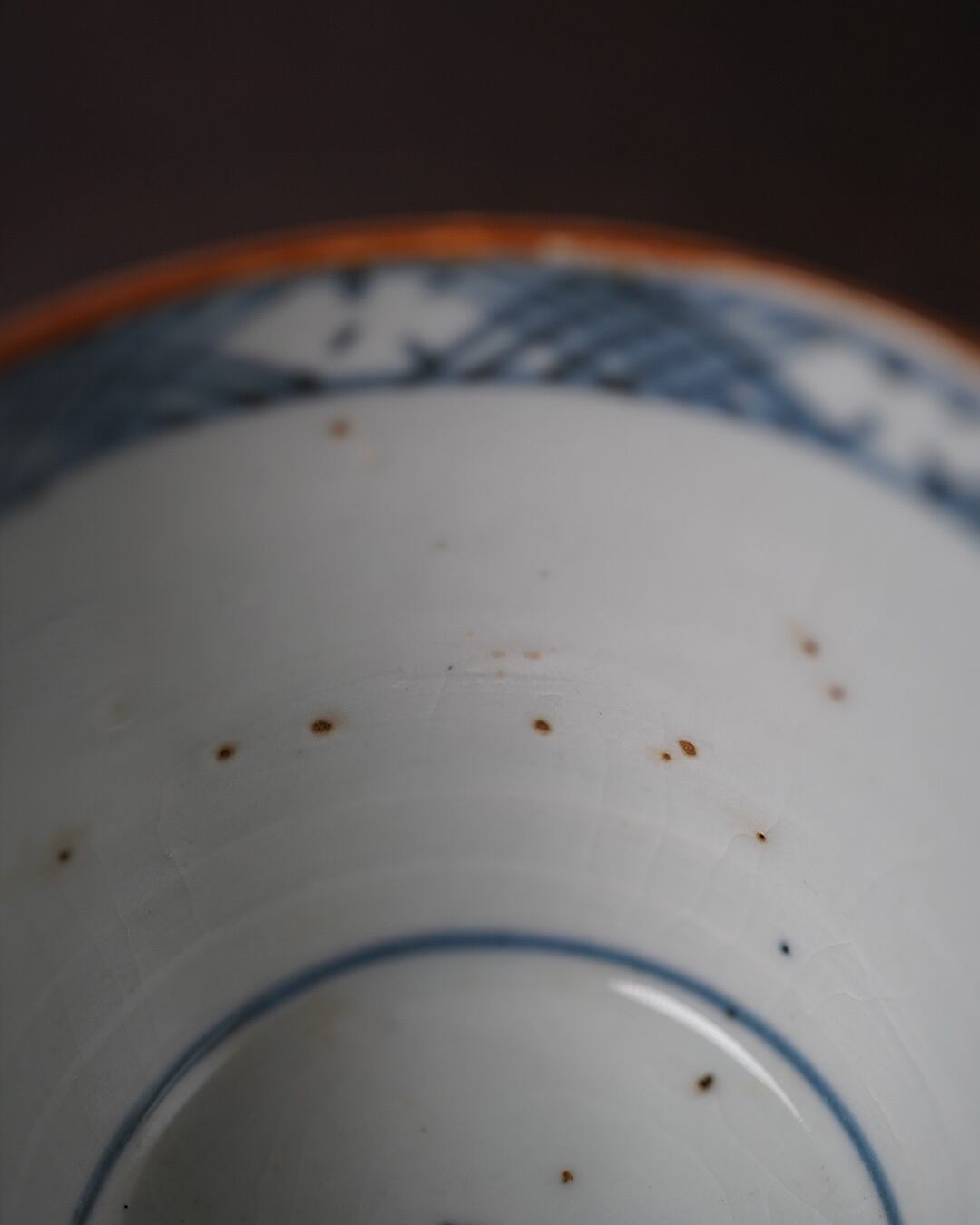 口縁には鉄釉が施され、器全体をきりりと引き締めています。この一線があることで、印象がぐっと上質なものになります。さらに、口縁内側や見込みにも文様が巡らされ、内外にわたり丁寧に絵付けが施されている点も、この個体の魅力です。わずかに楕円を帯びた口縁もまた、手仕事ならではの揺らぎを感じさせ、この猪口の美しさのひとつとなっています。高台は蛇の目高台で、江戸後期の仕様をよく伝えています。