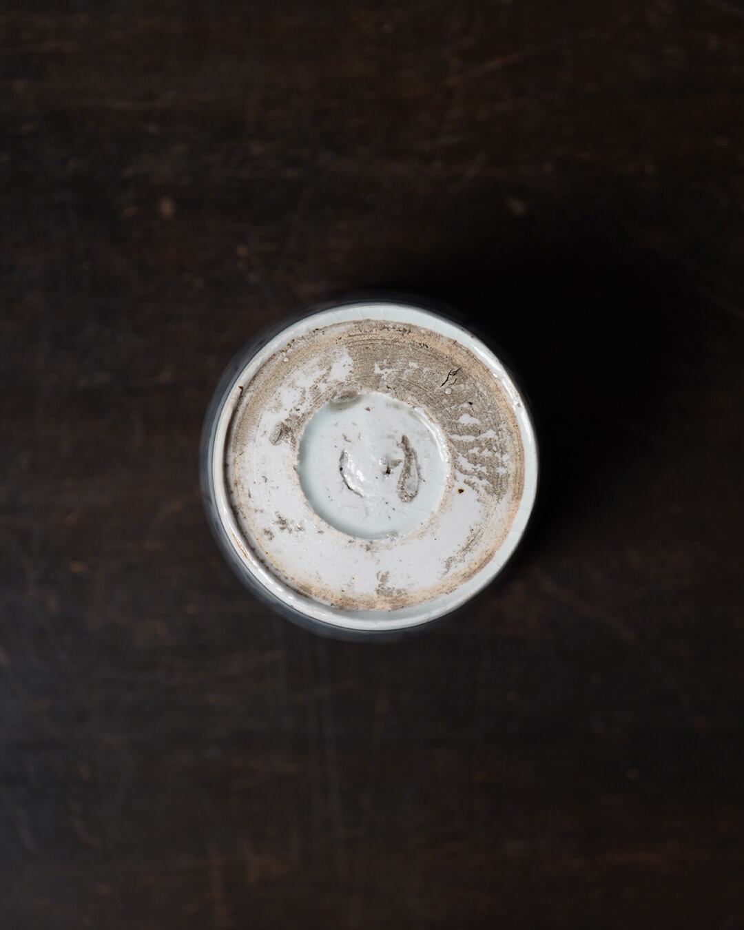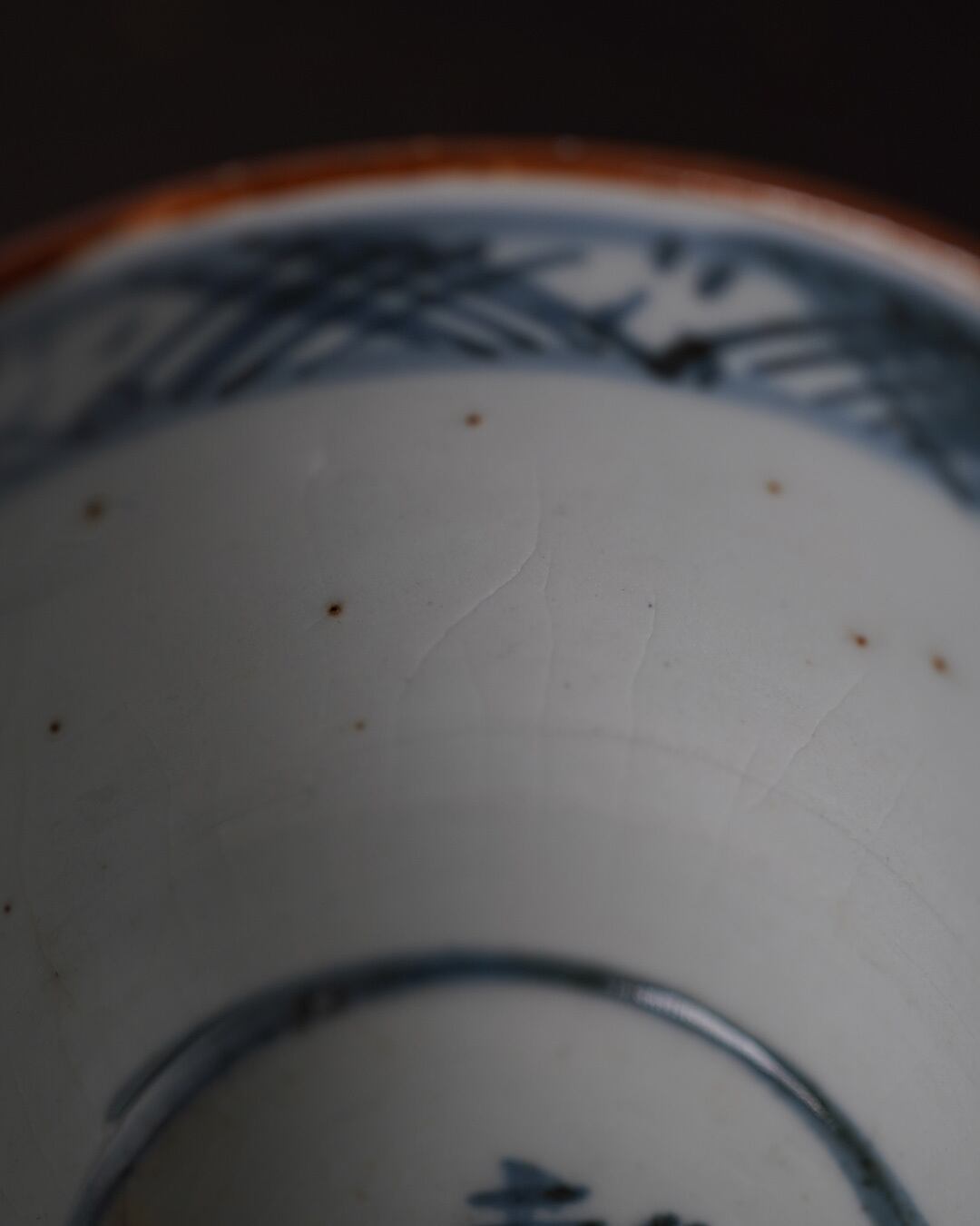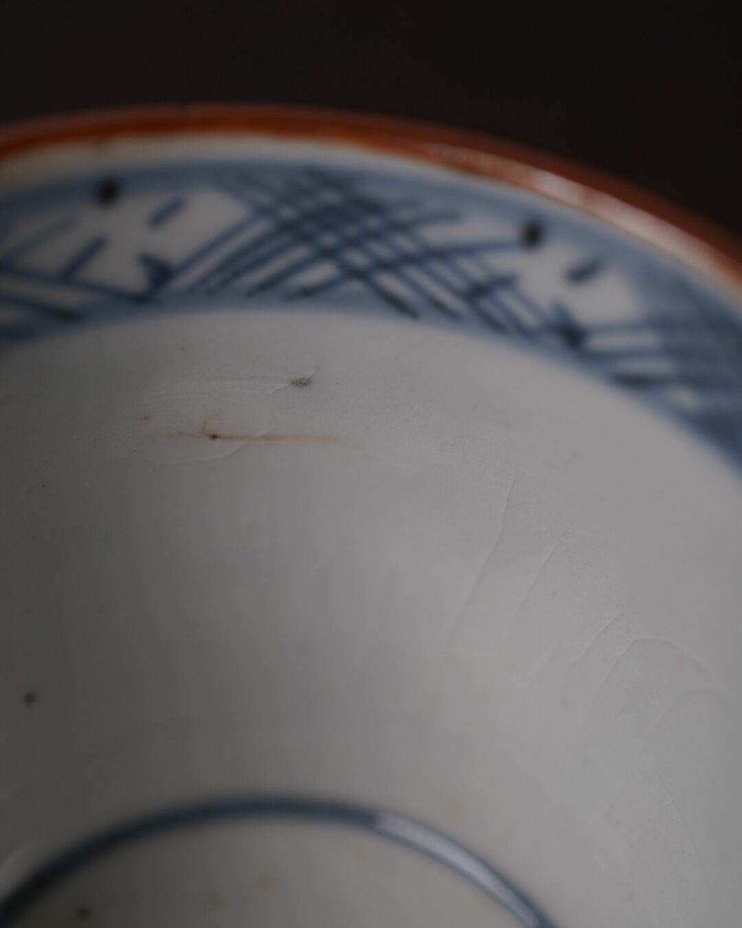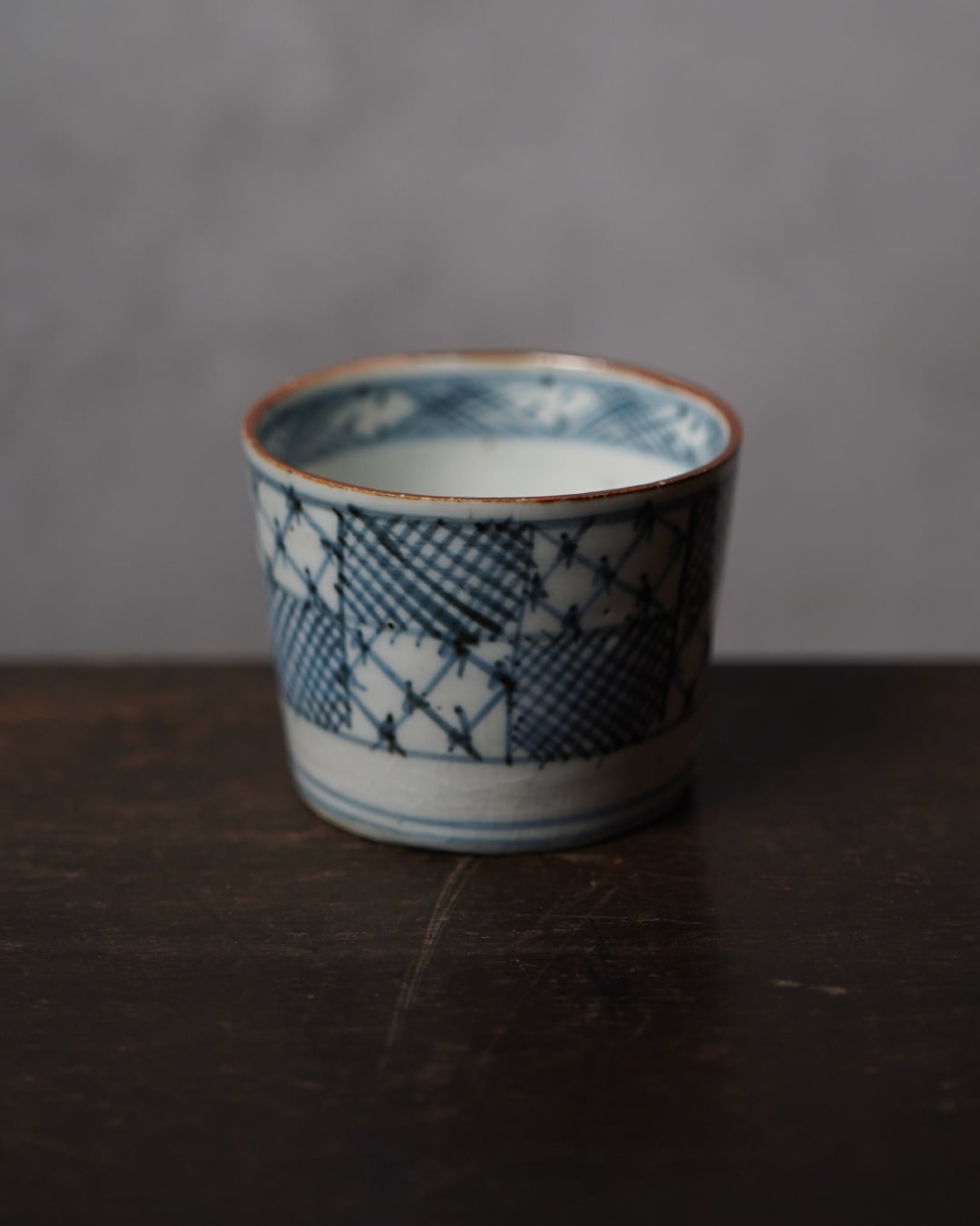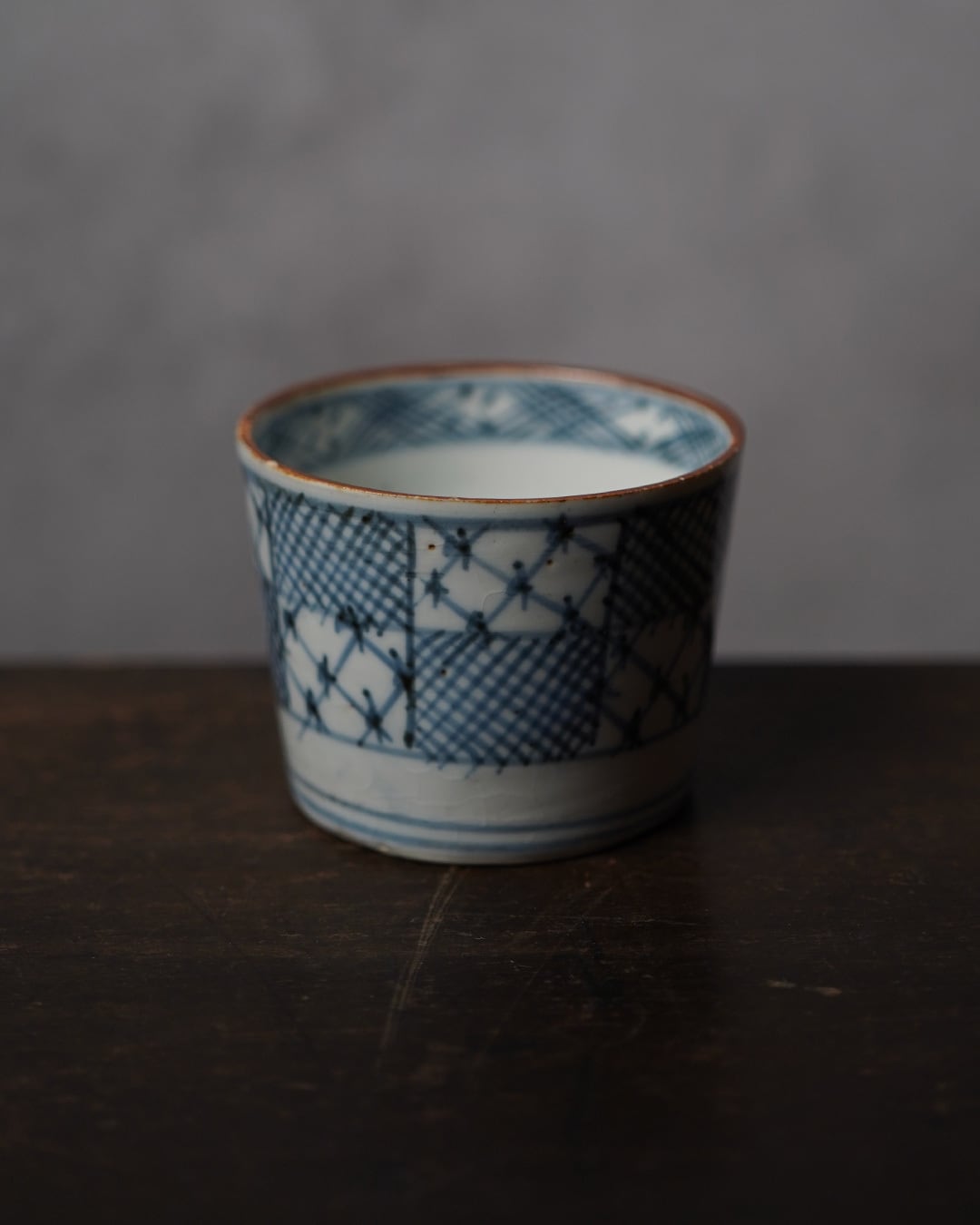 外側には濃淡を効かせた市松文様。格子を連続させたこの文様は、途切れることなく続くことから「繁栄」「継続」を象徴する吉祥文様とされています。落ち着いた風合いの呉須の色味と、絵付けと余白のバランスが心地よく、手掛けた職人の美意識の高さを静かに物語ります。
