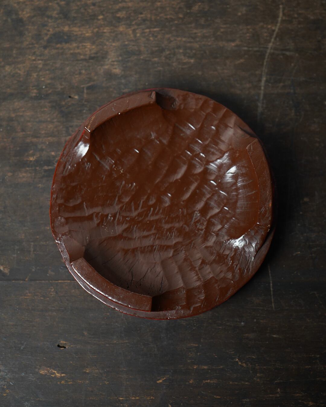 深みのある朱漆と鑿目(のみめ)が印象的な、趣ある飾り台です。