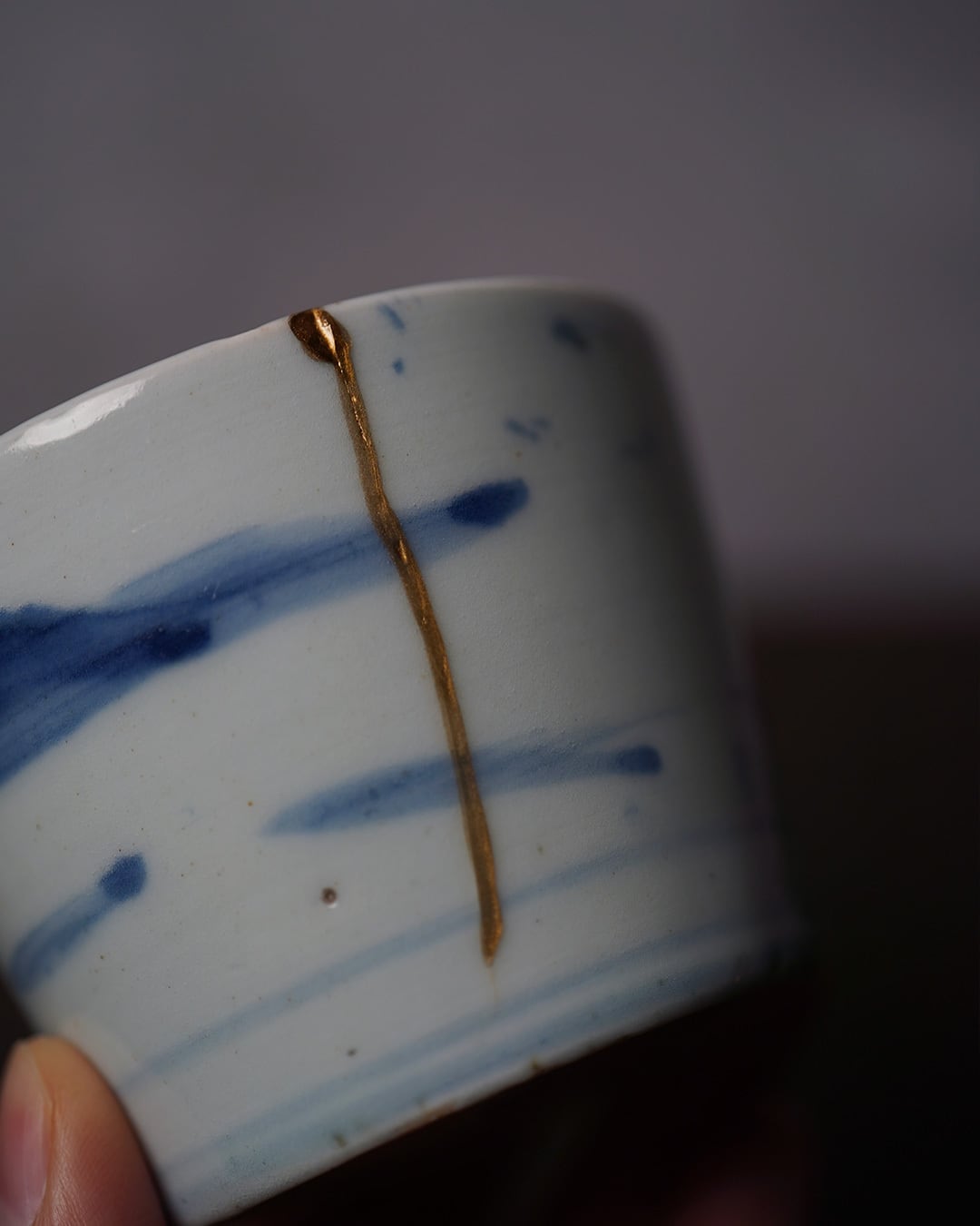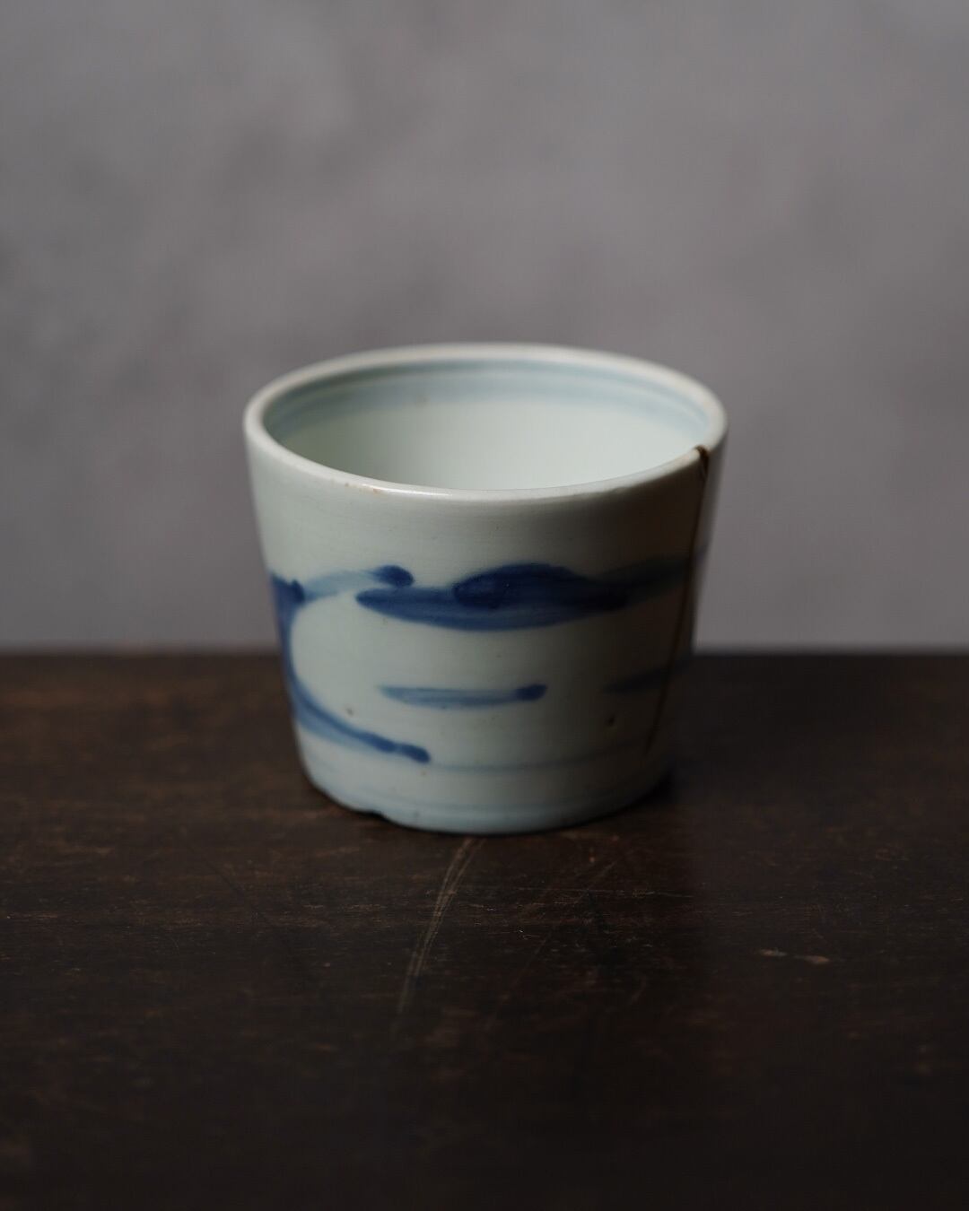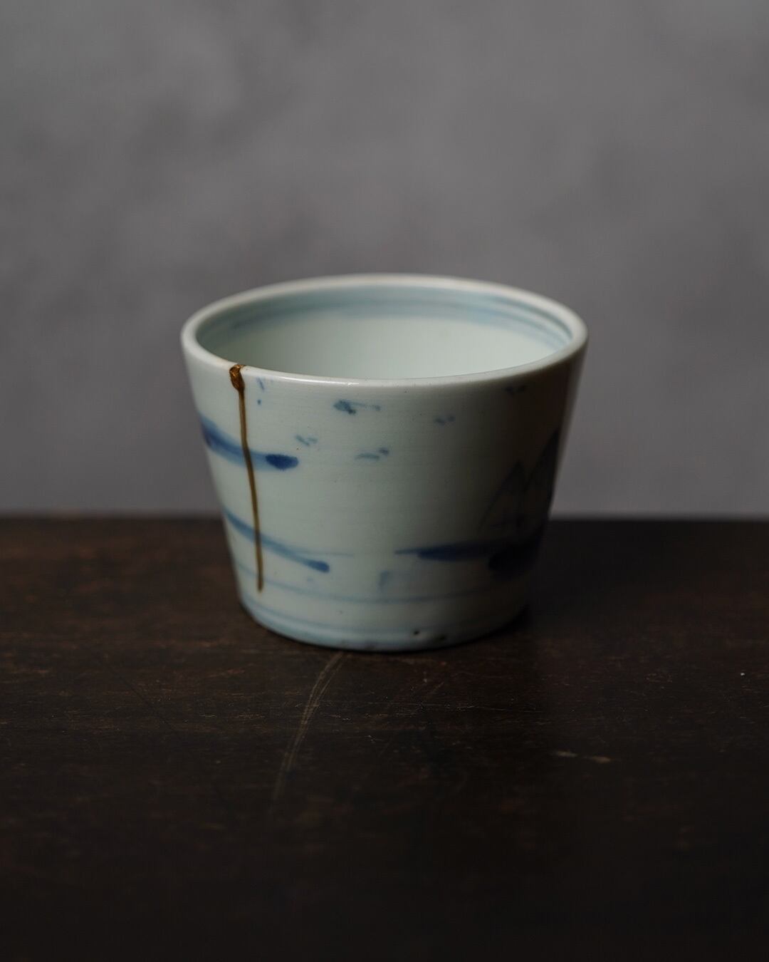 金継ぎによる直しが施されていますが、一本走る金の線もまた、この器の景色の一部となっています。手仕事ならではの揺らぎを残した、わずかに楕円を帯びた口縁も、この猪口の魅力のひとつです。高台は江戸後期の特徴である蛇の目高台。