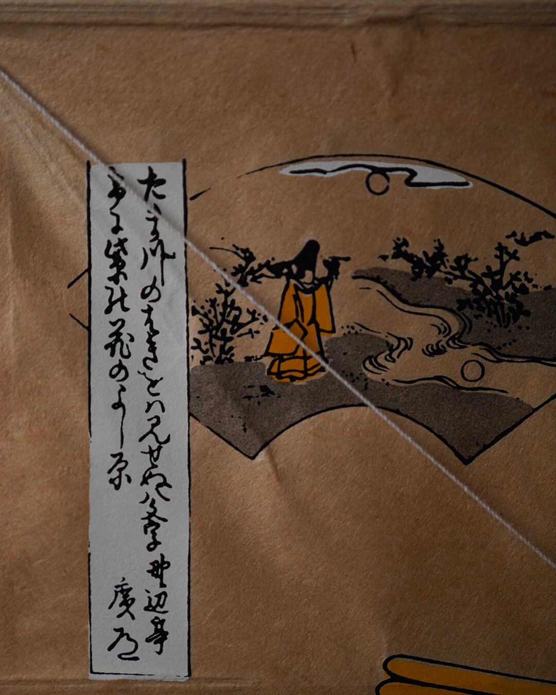 余白を生かした構図と、伸びやかな線描が印象的です。上部には扇面に和歌が添えられ、江戸情緒を感じさせます。素材には手漉き和紙と天然の竹ひごを使用。裏面の骨組みからも、軽やかで合理的な和凧の構造美がうかがえます。