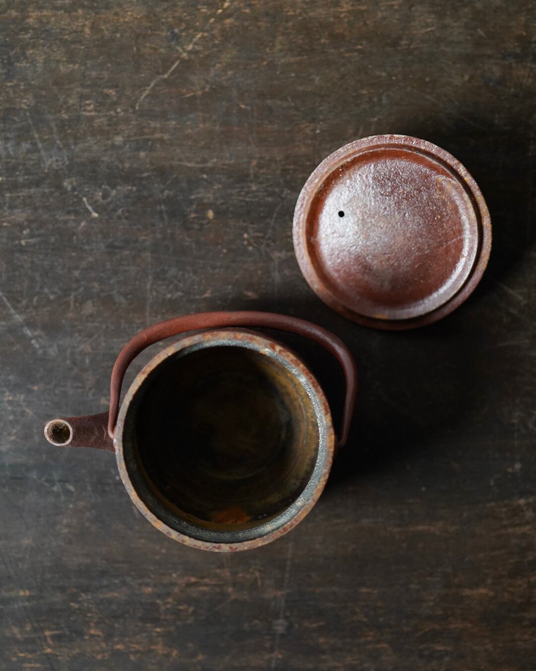使い込まれ、飴色へと変化した鉄肌は、まるで本物の桜皮のよう。所々に見られる錆も景色の一部となり、味わいを深めています。開口部がゆったりと広いのも特徴のひとつ。茶葉の出し入れや手入れがしやすく、実用の面でも優れています。