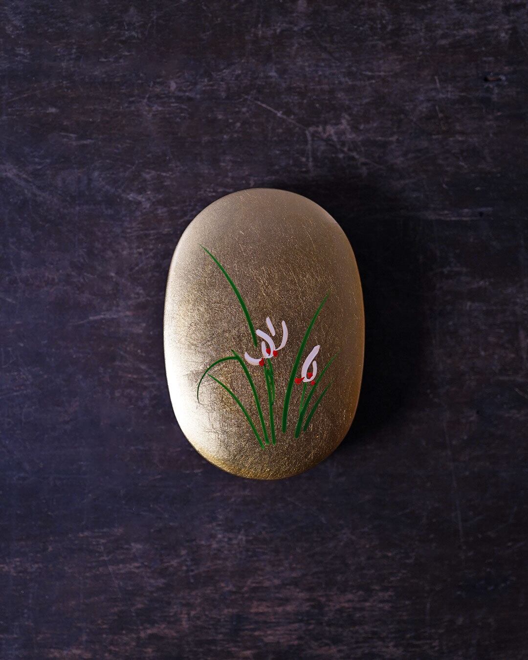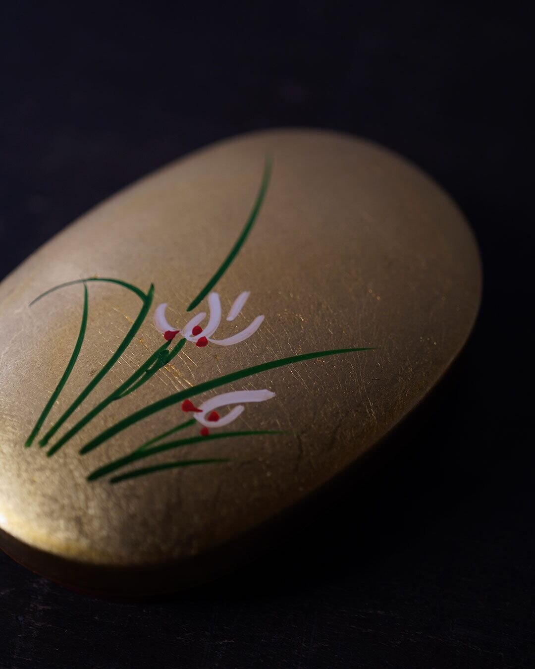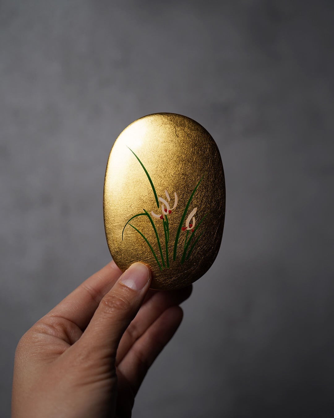 やわらかな丸みを帯びた蓋一面に金箔を施し、光を受けるたびに揺らぐような繊細な輝きを見せます。金箔はおよそ一万分の一ミリという極限の薄さにまで打ち延ばされながらも、金本来の輝きを失いません。きめ細かな箔肌が奥行きを生み、単なる金色とは異なる華やぎを湛え、加賀百万石の美意識を今に伝える佇まいです。