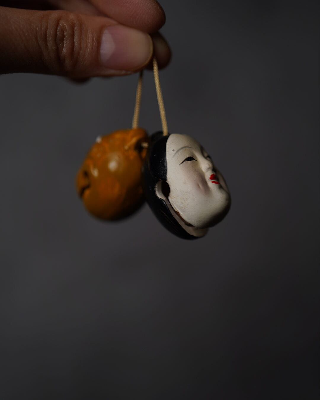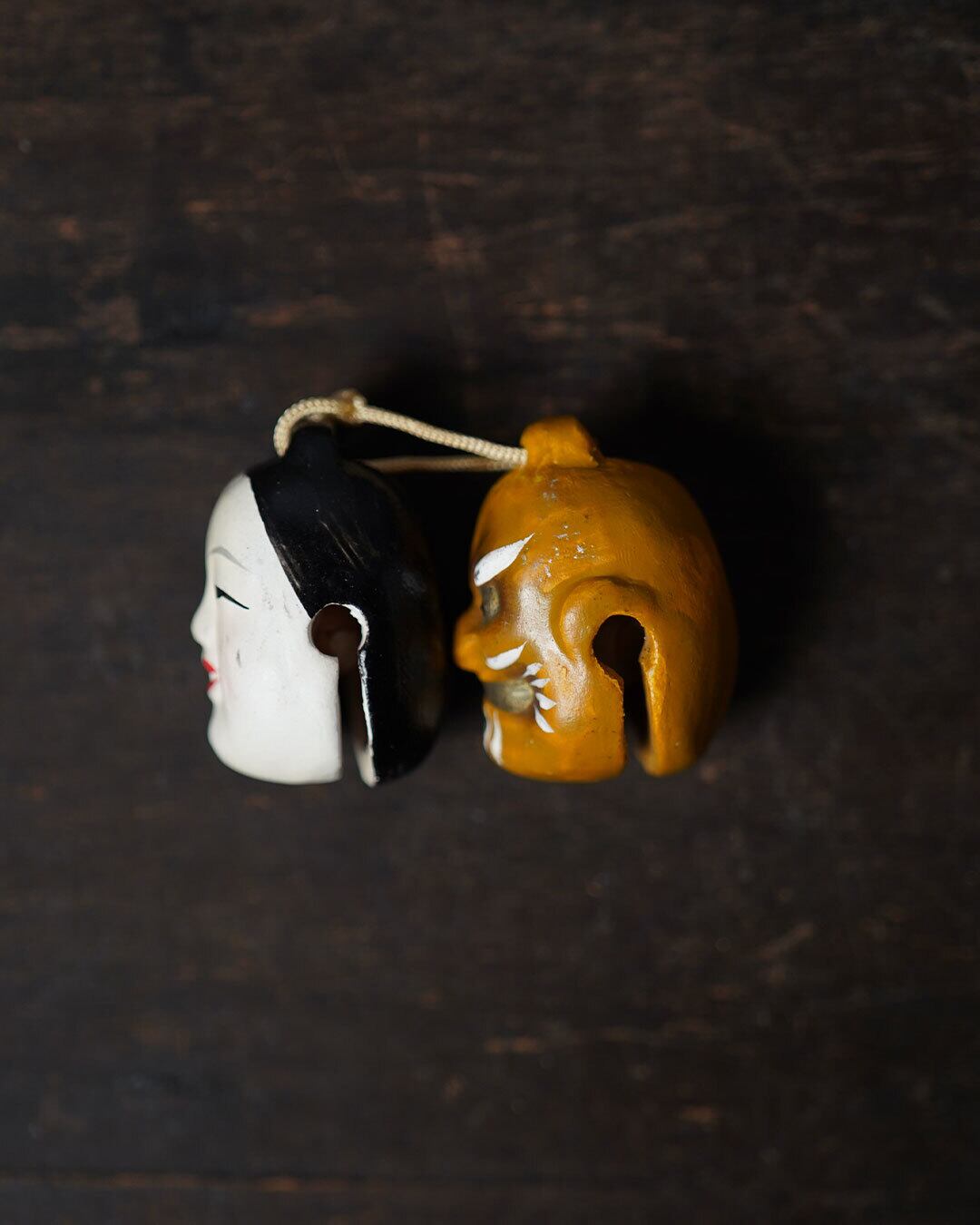 柔らかな白肌の表情と力強い鬼面の対比が印象的で、素朴ながら物語性豊かな造形です。