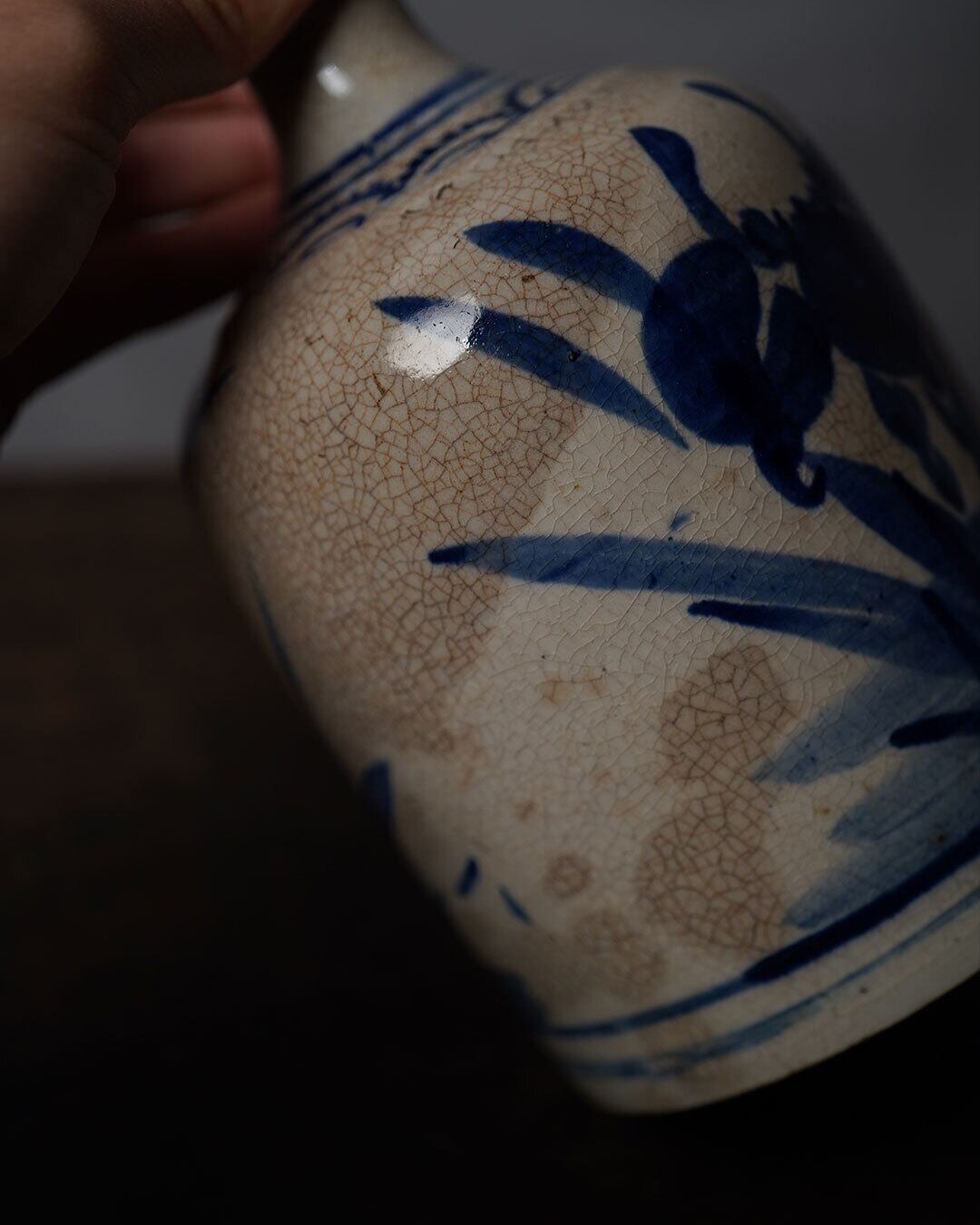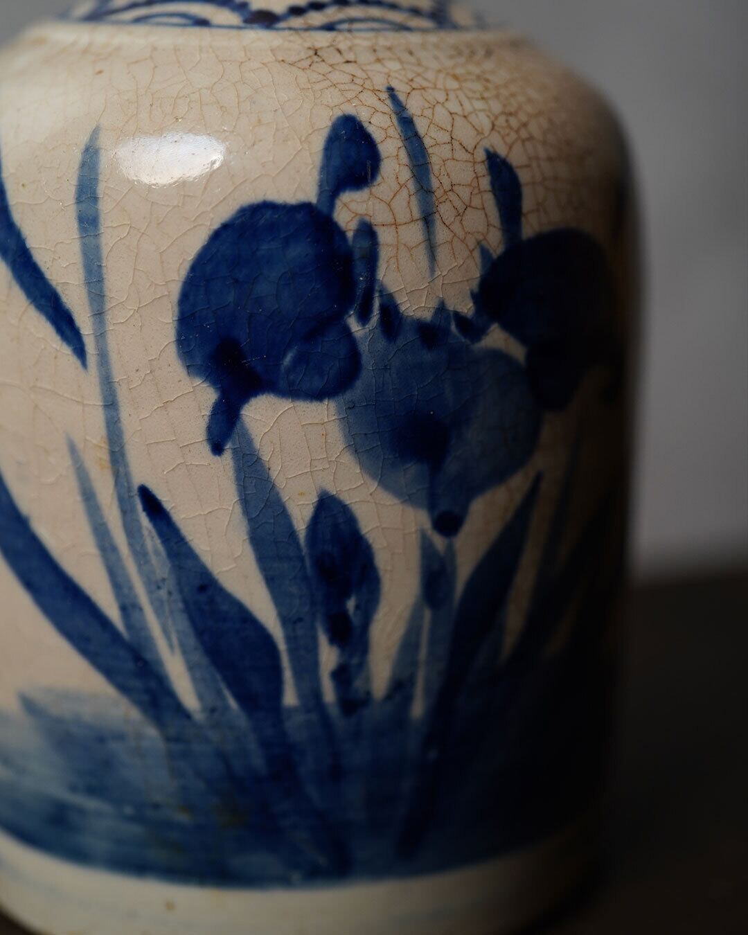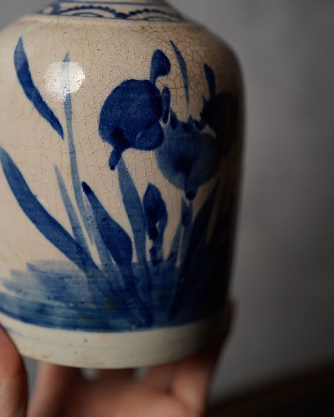 乳白色の釉肌には細やかな貫入が広がり、時代を経た確かな景色を宿しています。描かれたのはアヤメ科の花と思われますが、水辺に生えているように表現されていることから、杜若(かきつばた)と推定されます。濃淡を含んだ藍の筆致はおおらかで、写実に寄りすぎない簡潔な描写が、かえって花の生命感を伝えます。
