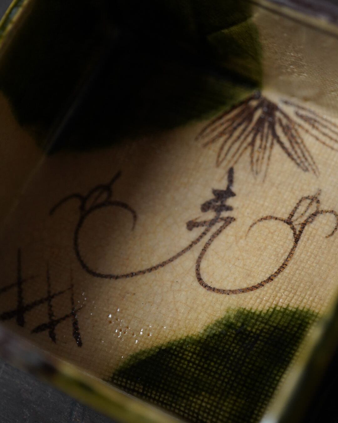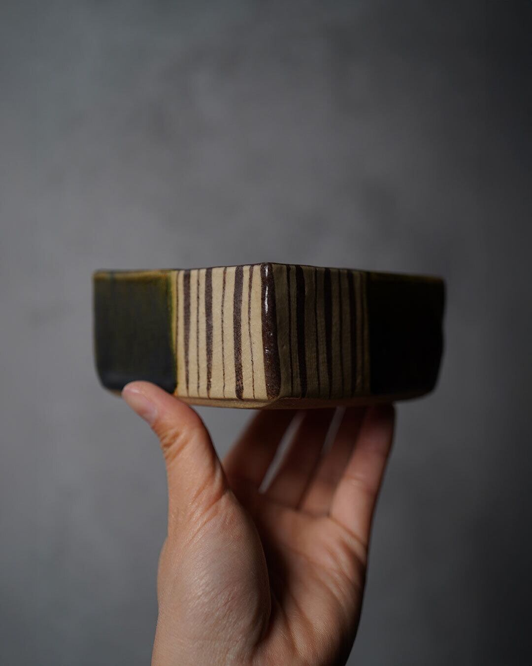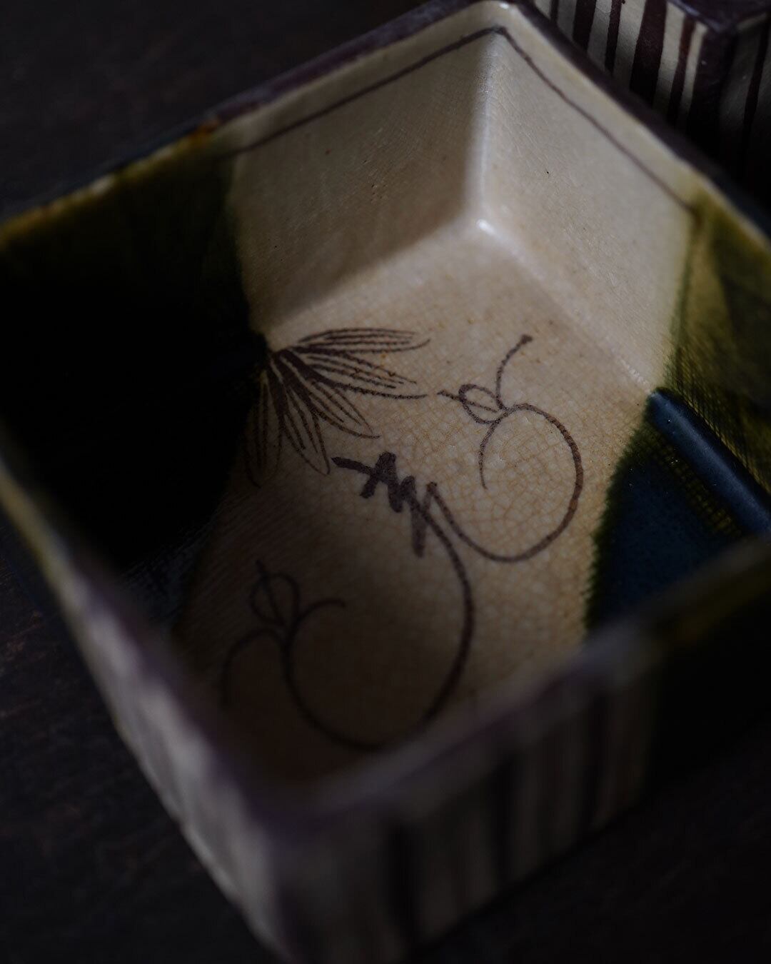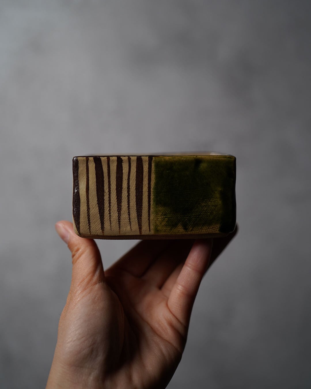 外側には縦縞文。素朴な筆のリズムが器全体を引き締め、四方形の端正な造形とよく調和しています。角のわずかな丸みや、釉の溜まりに見える深い緑が、手仕事ならではの温度を静かに伝えます。