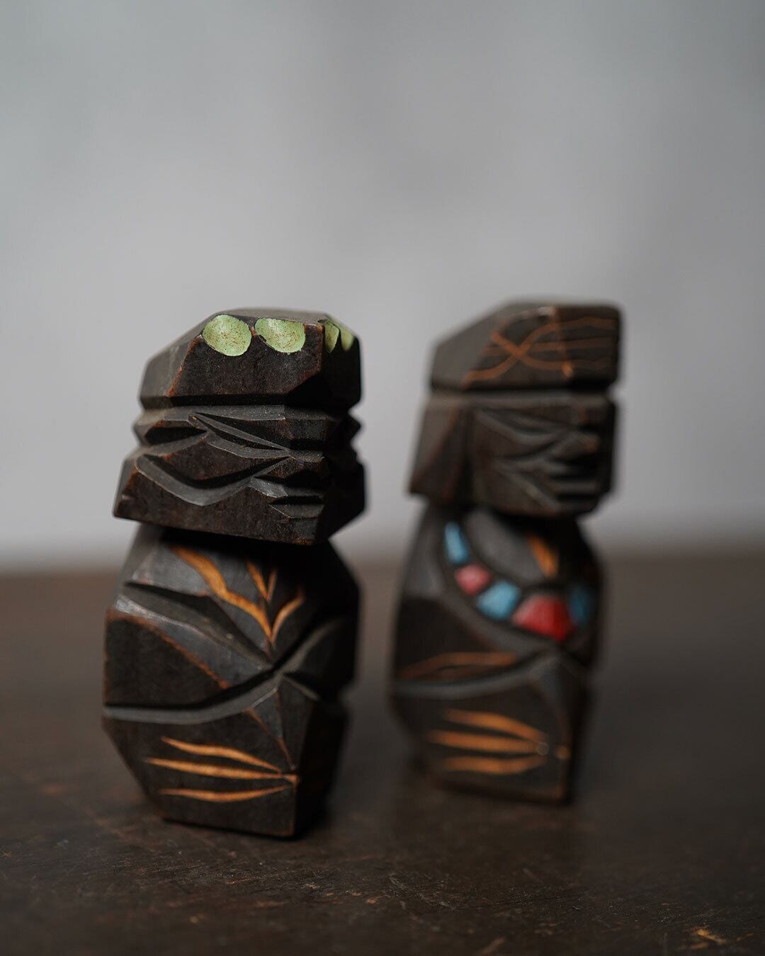 直線的な面構成と簡潔な造形によって人物像を立ち上げており、伝統的なアイヌ彫刻の意匠を踏まえながらも、どこかモダンで彫刻的な印象を備えています。部分的に施された彩色が、木地とのコントラストとなり、像にリズムと表情を与えています。