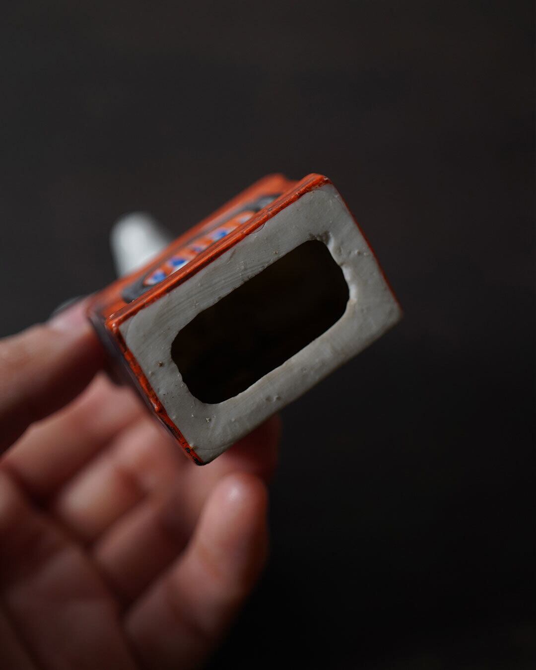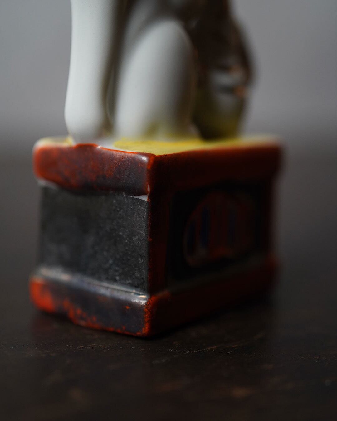 白磁の艶やかな肌に、朱と金彩をあしらった小ぶりな狐像です。