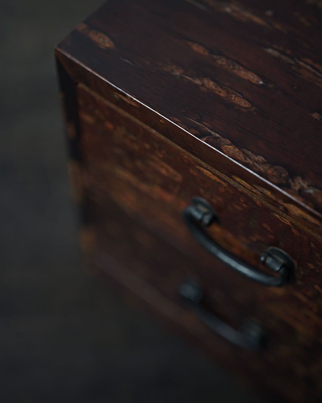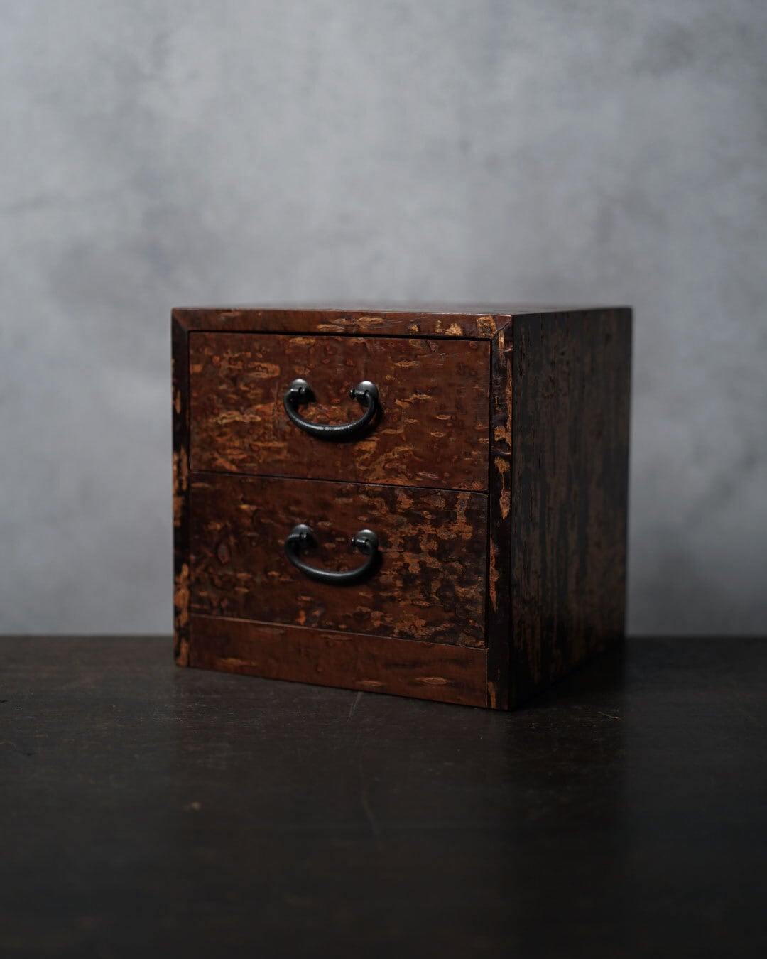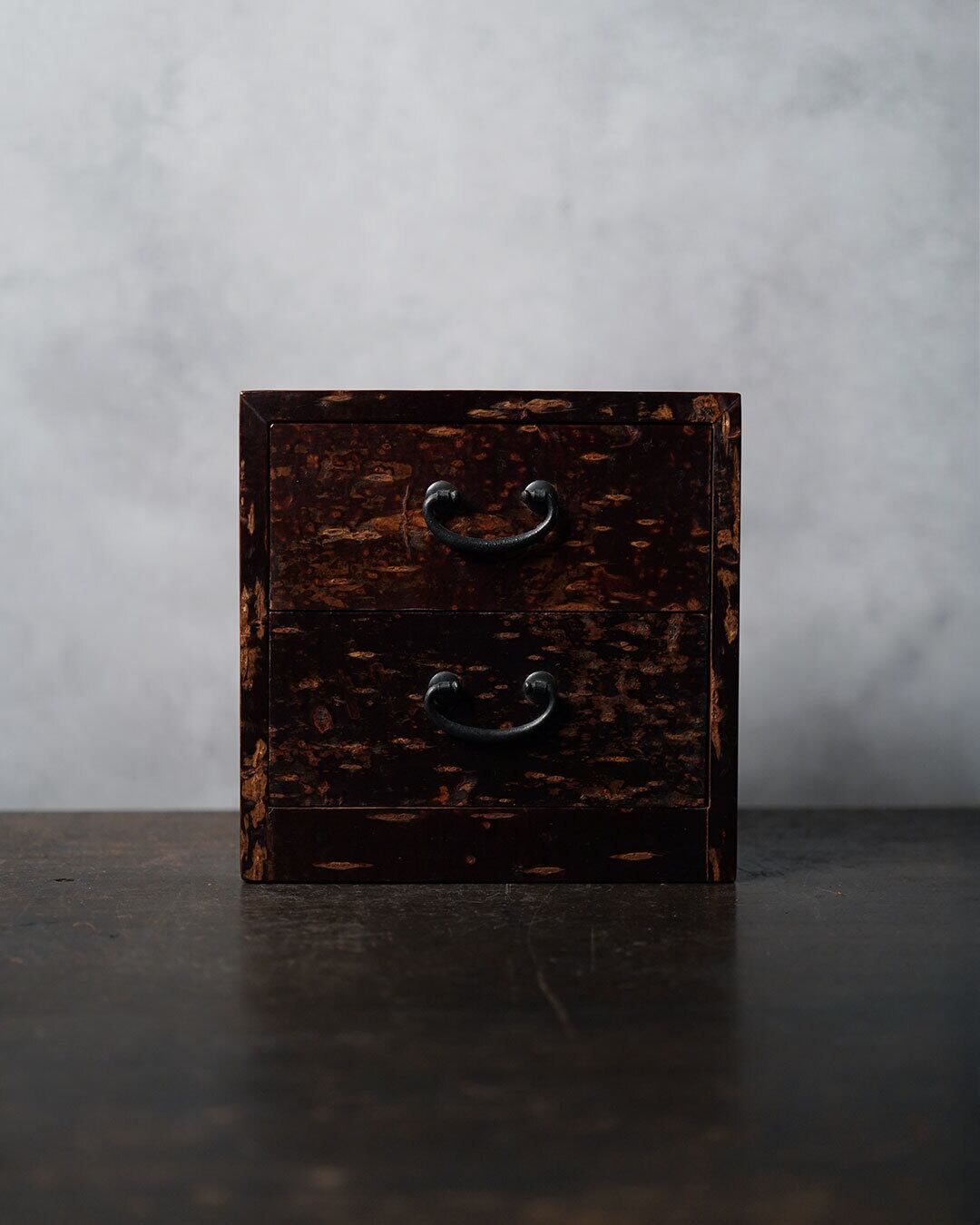秋田の伝統的工芸品・樺細工(桜皮細工)による、二段の小引き出しです。