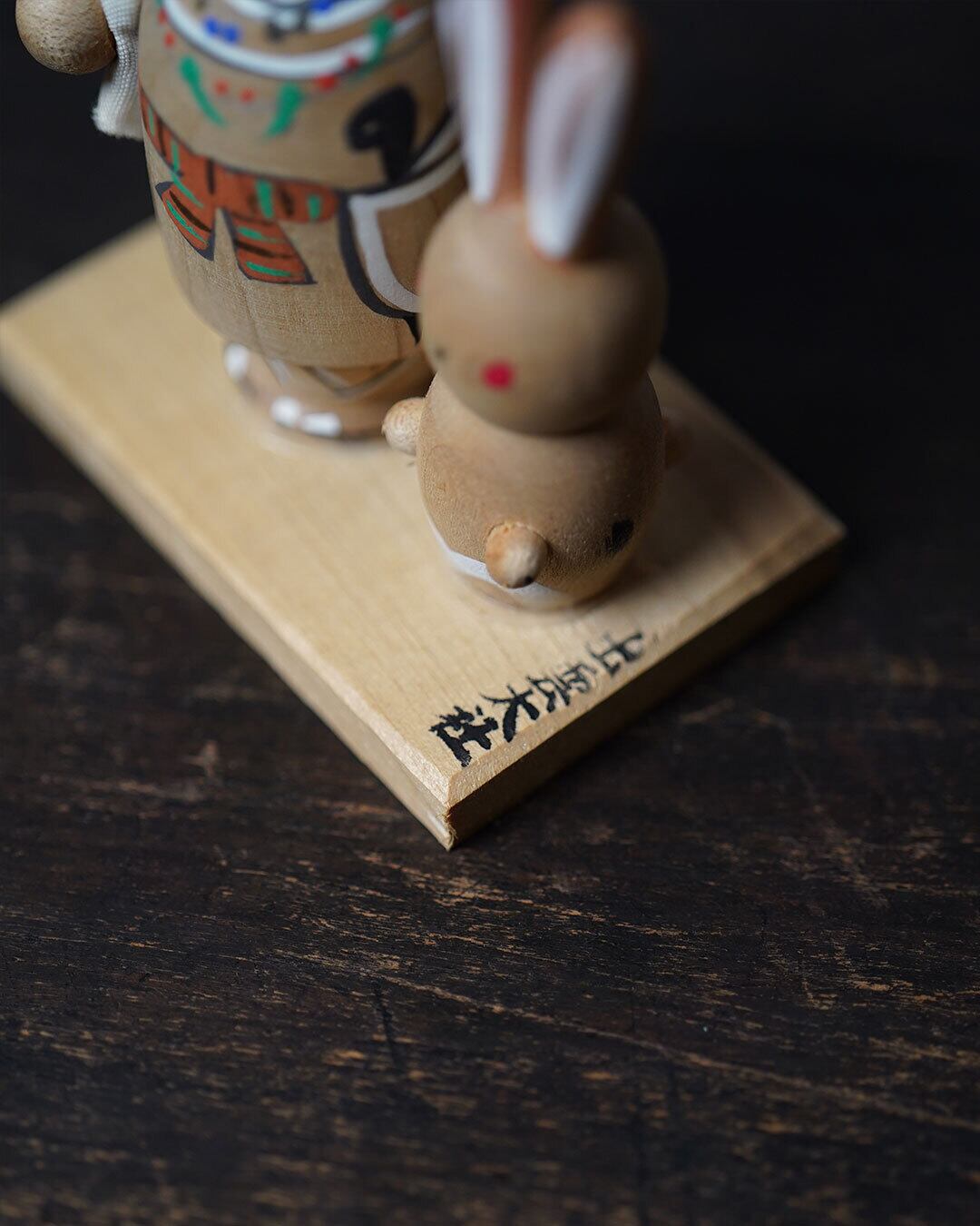 木地のあたたかみを生かした造形に、衣や兎の表情を最小限の筆致で添え、見るほどに親しみが増す佇まい。台座に据えた姿も安定感があり、神話を身近に感じる置き物として静かに空間に馴染みます。