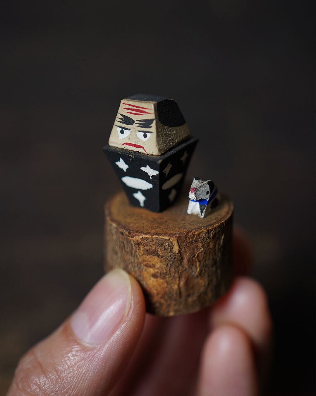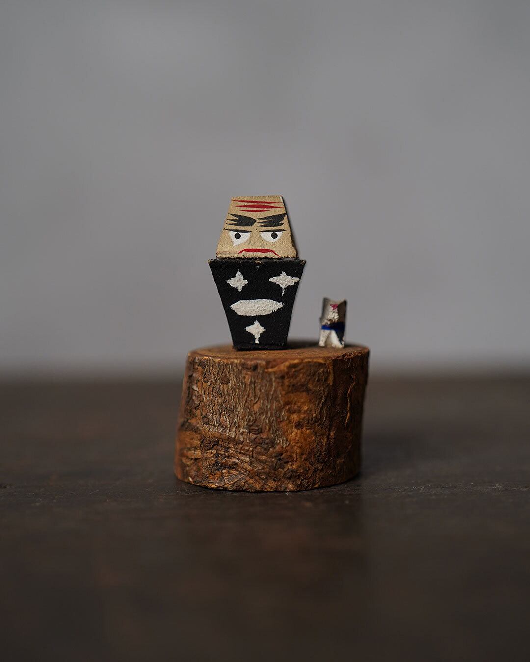 衣の黒地に配された文様、朱を差した表情、直線と面で構成された西郷どんの姿。写実を目的とせず、象徴として人物を捉えた造形には、民芸や郷土玩具に通じる素朴さと、現代的なデザイン性が同居しています。