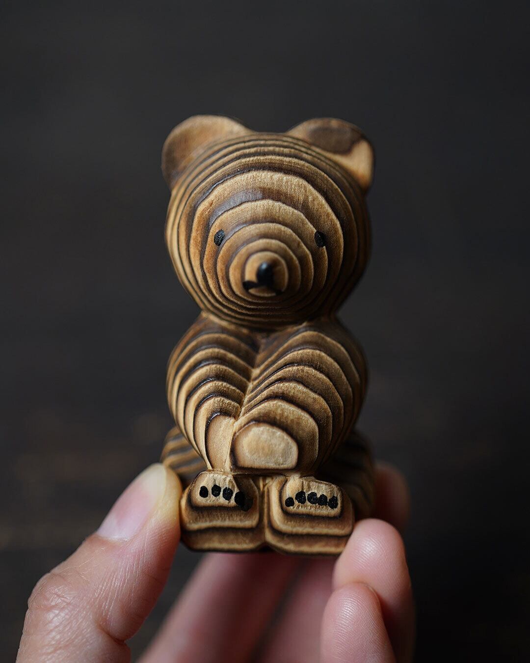 子熊をモチーフとしているため愛嬌のある表情を見せ、年輪がそのまま毛並みのように表れています。