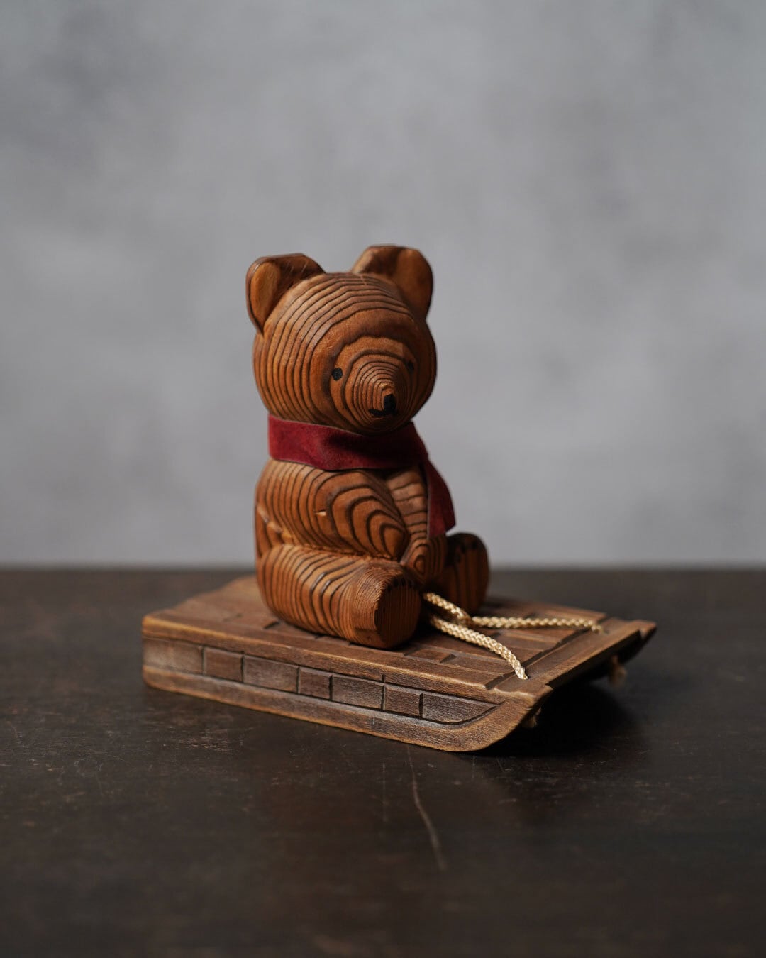 美しい木目を生かした熊ボッコを、そりに乗せた木彫作品です。