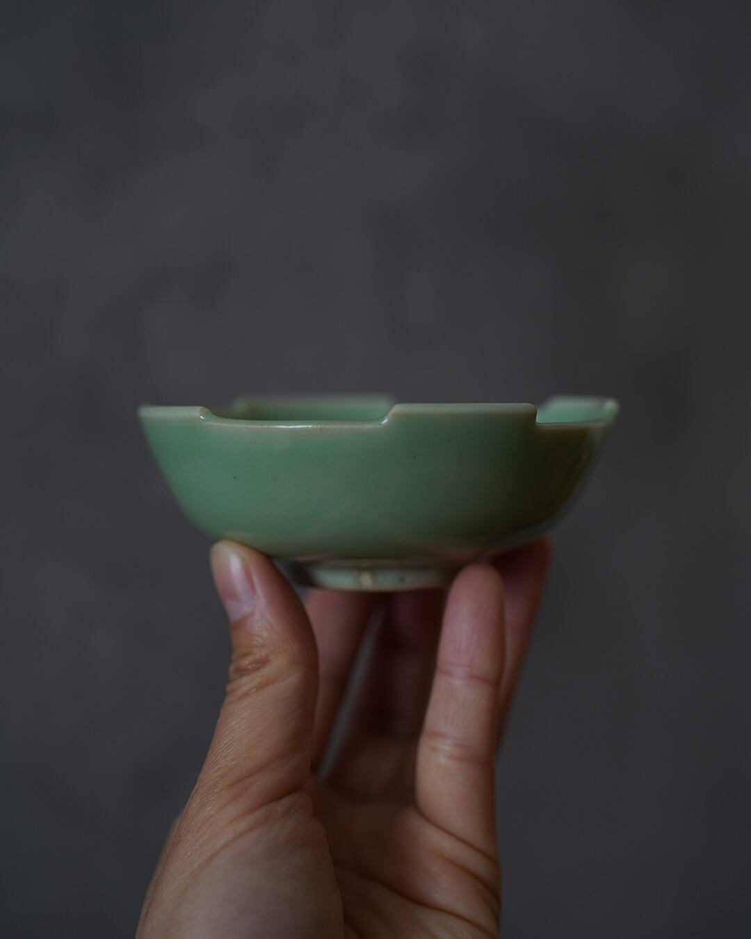 釉色は、澄んだ光を湛えた美しい翡翠色。光の加減によって深みのある緑にも映ります。縁に設けられた控えめな切り込みが、端正な丸形にさりげない表情を添えています。高台まわりには時を経たわずかな窯跡や色づきが見られ、古器ならではの落ち着きを感じさせます。