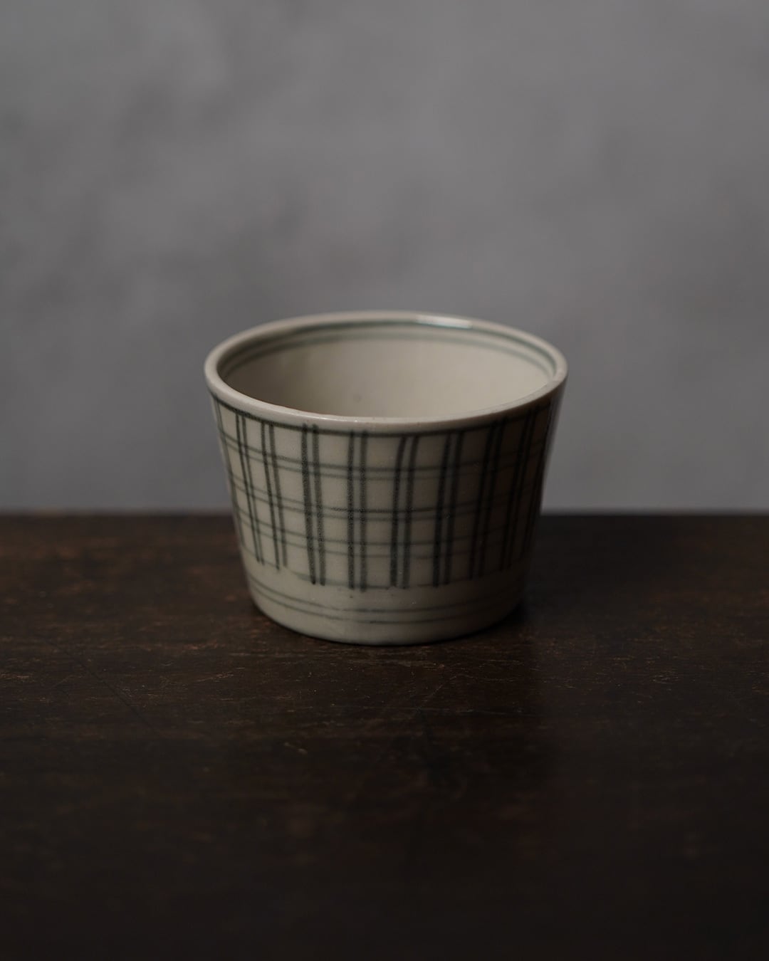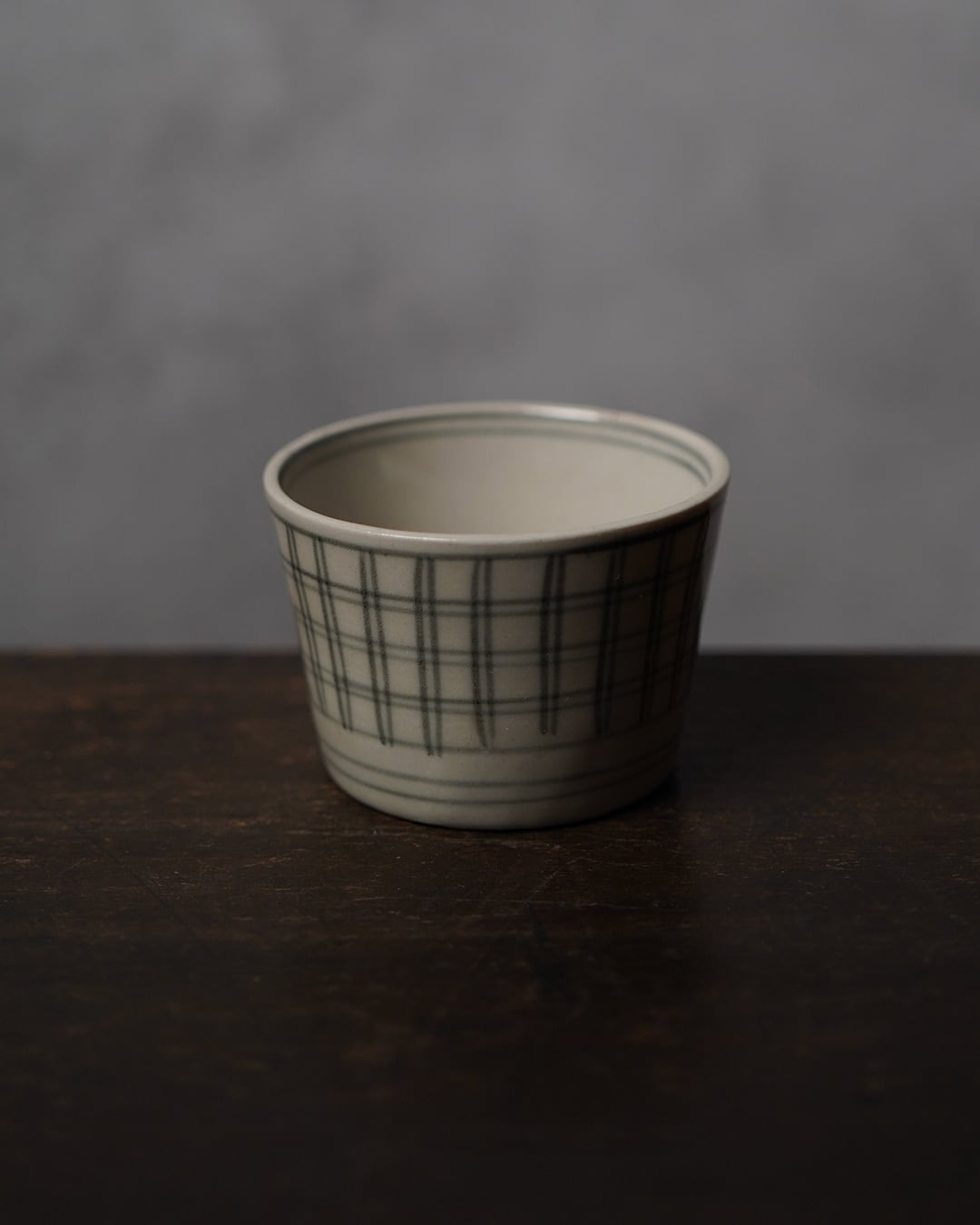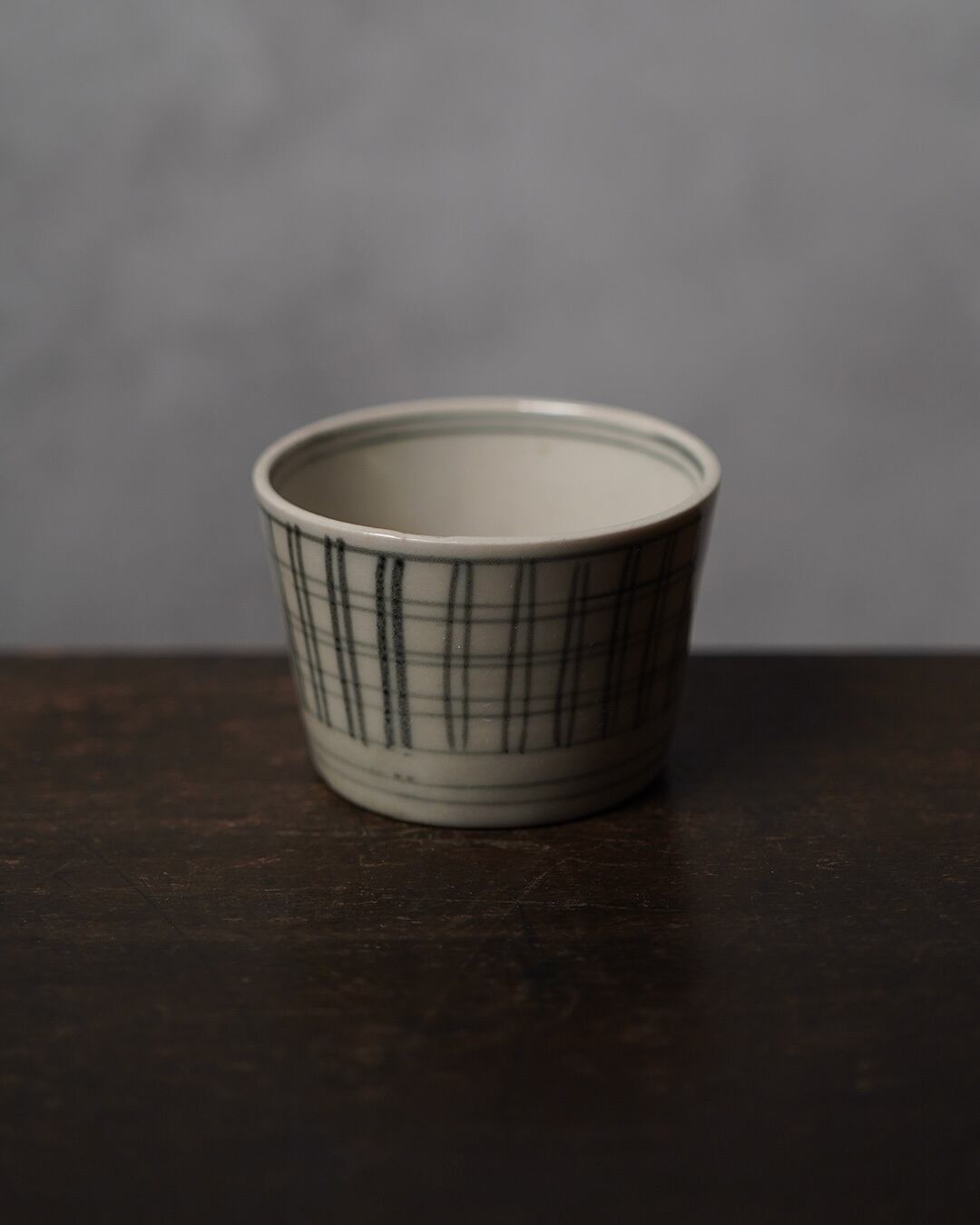 手描きの格子文を巡らせた、端正な佇まいの猪口です。