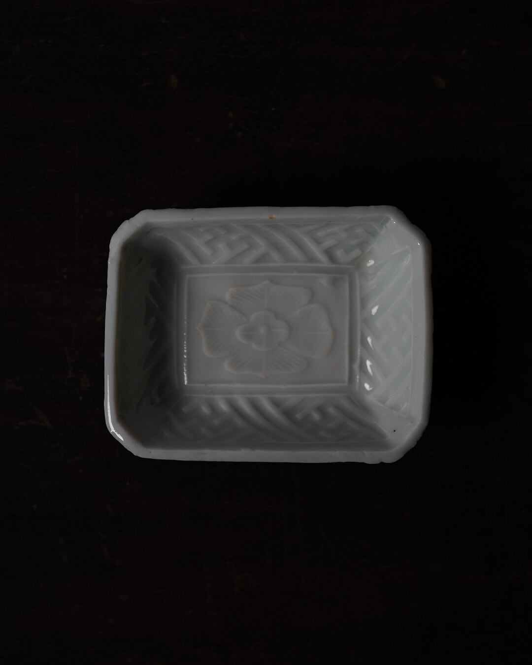 釉はやわらかく澄んだ白磁。ほのかな青みを帯びた静かな白が、彫りの輪郭を穏やかに際立たせます。角を落とした隅切の形状は手取りもよく、浅めの立ち上がりが料理を上品に受け止めます。明治期頃の作と推定されます。