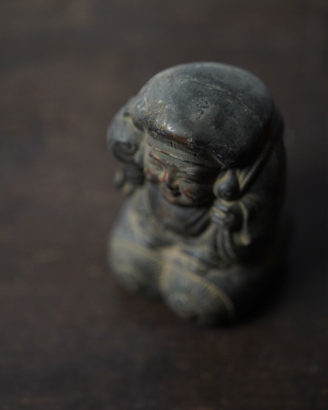 表面には長い年月を経て生まれた摩耗や黒ずみが現れ、ところどころに赤味を帯びた金属の表情がのぞきます。時を経た金属像ならではの風合いです。