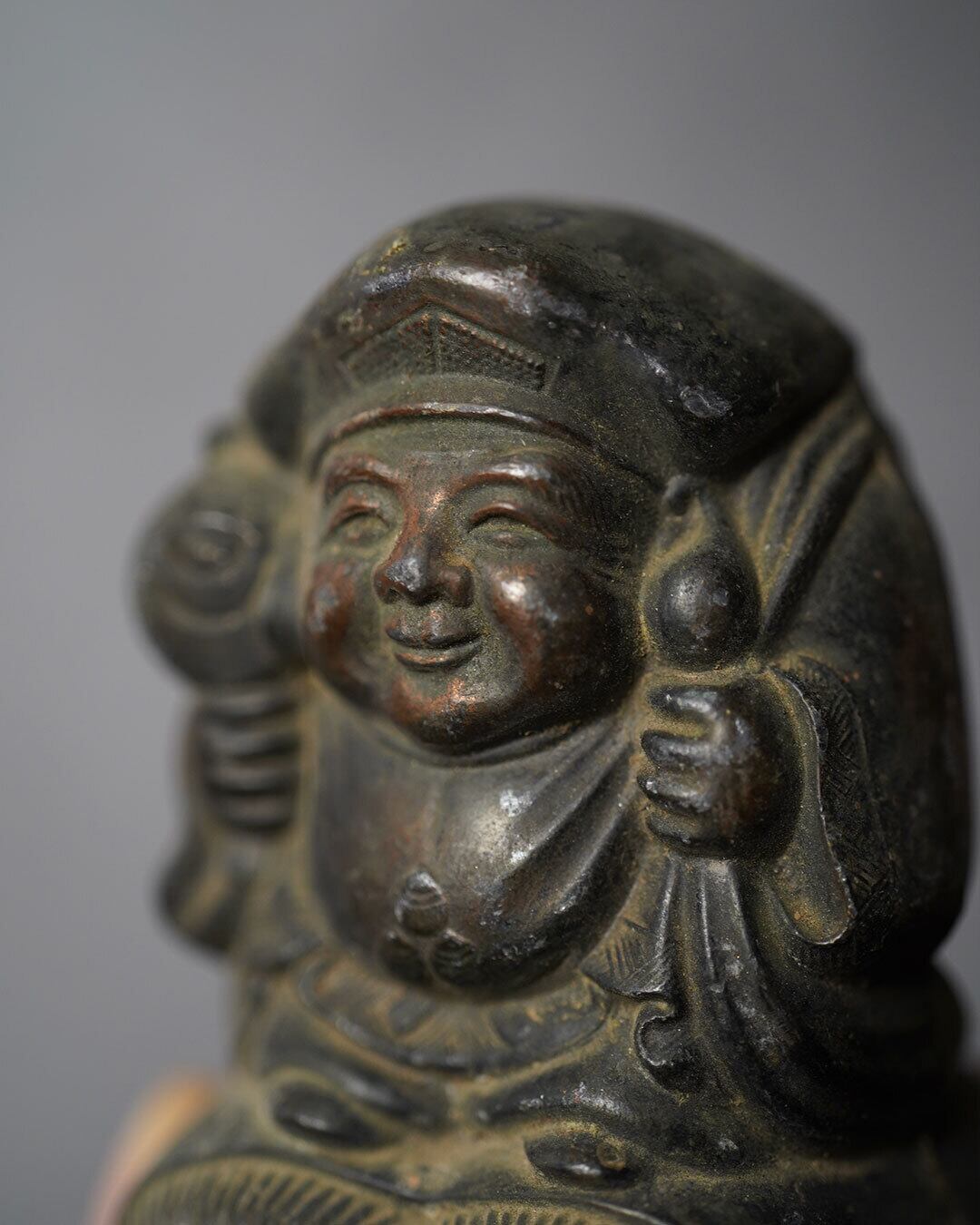 おそらく青銅製と考えられる、貯金箱として作られた大黒天像です。