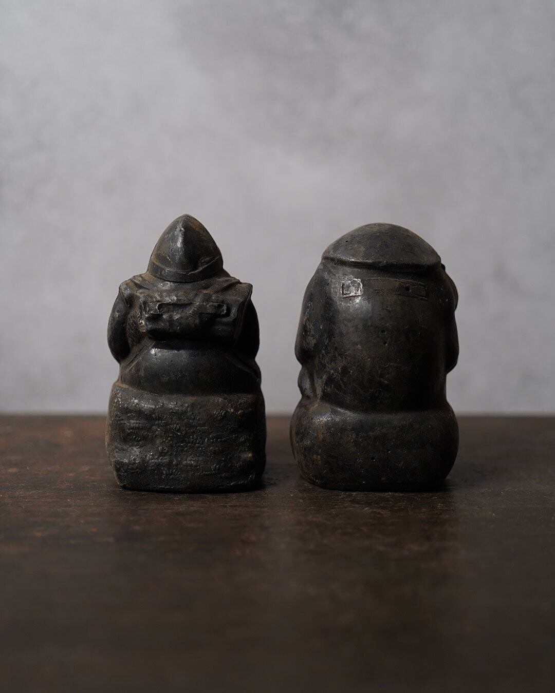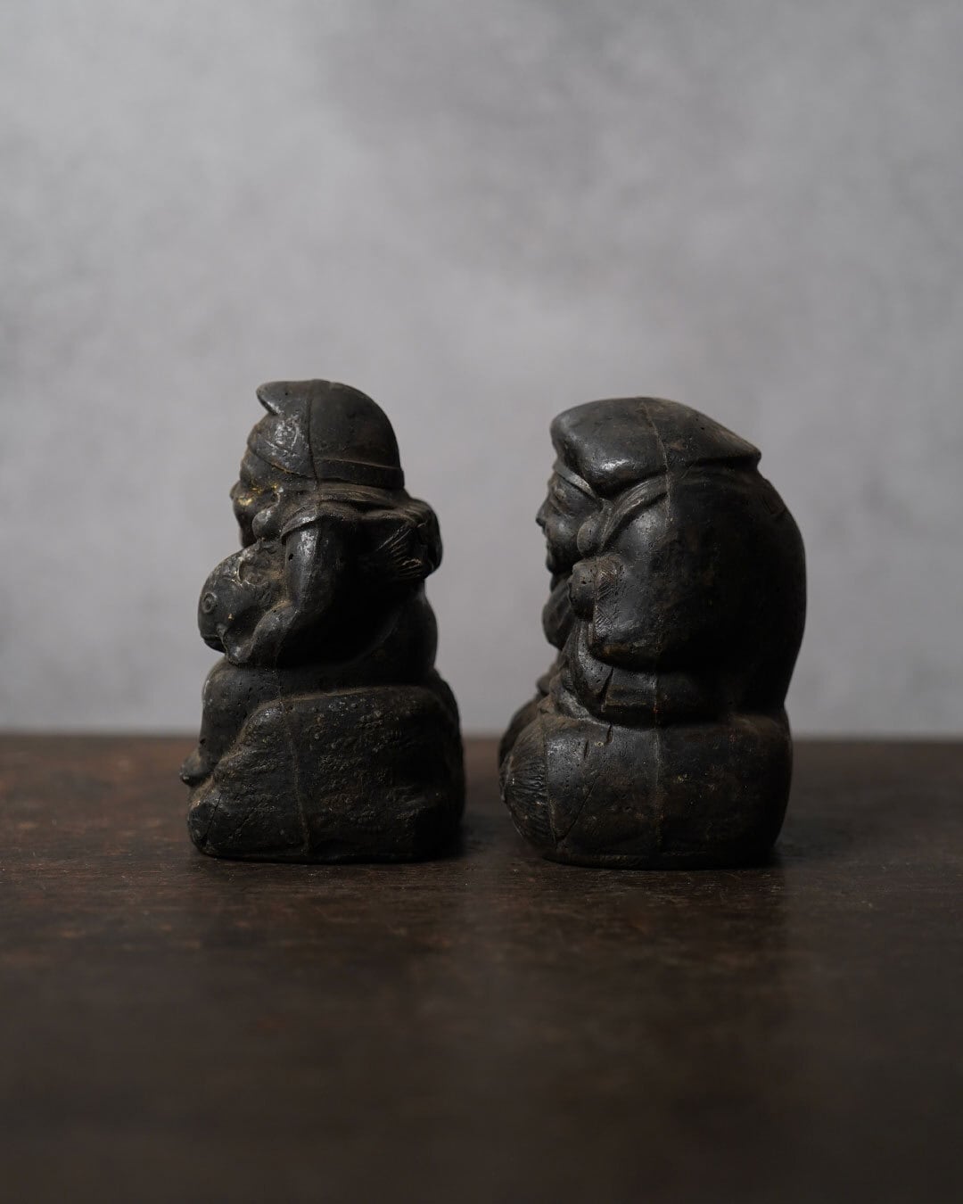 金属製の貯金箱として作られ、のちに置物へと役割を変えたと考えられる、恵比寿大黒天像の一対です。後年、樹脂のような別素材によるコーティングが施されることで内部の空洞は塞がれ、祈りの像として静かに佇む姿へと移ろっていったことがうかがえます。