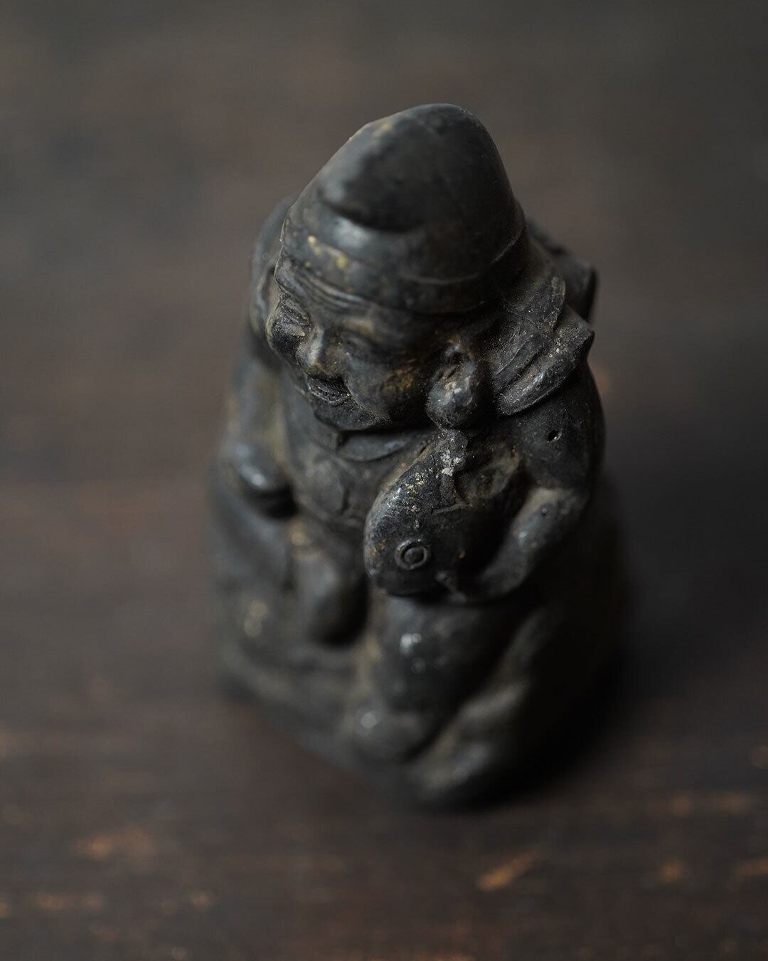 硬質な素材でありながらも、どこか柔らかな量感を湛えています。大きな福耳と、優しく穏やかな表情は、日々の営みのそばで福を呼び込み、そっと見守ってきた存在であったことを物語ります。