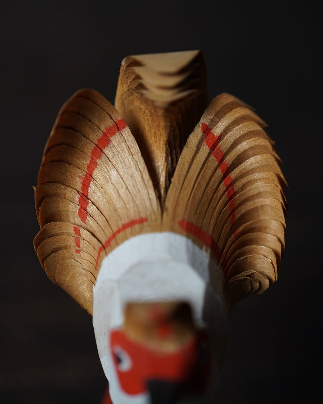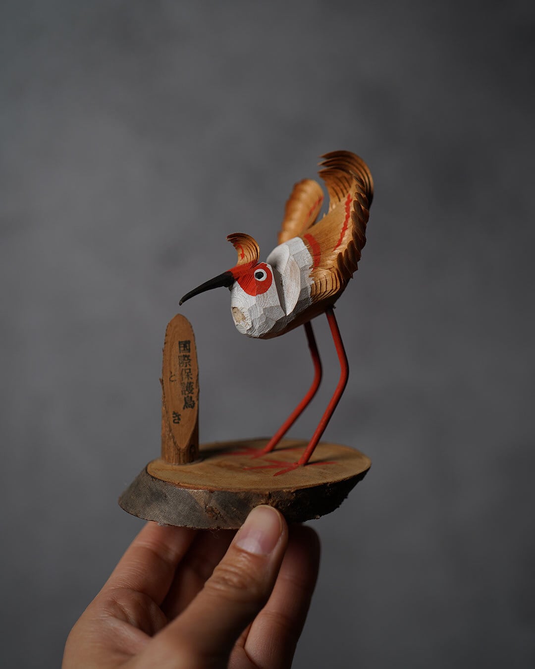 大きく広げた翼は一刀ごとのリズムがそのまま残され、羽ばたきの瞬間を捉えたような躍動感があります。朱を差した脚と、目元の赤が印象的で、トキの気高い姿を象徴的に描き出しています。台座には「国際保護鳥 とき」と記された札が添えられ、時代背景や人々の願いも静かに伝えてくれます。