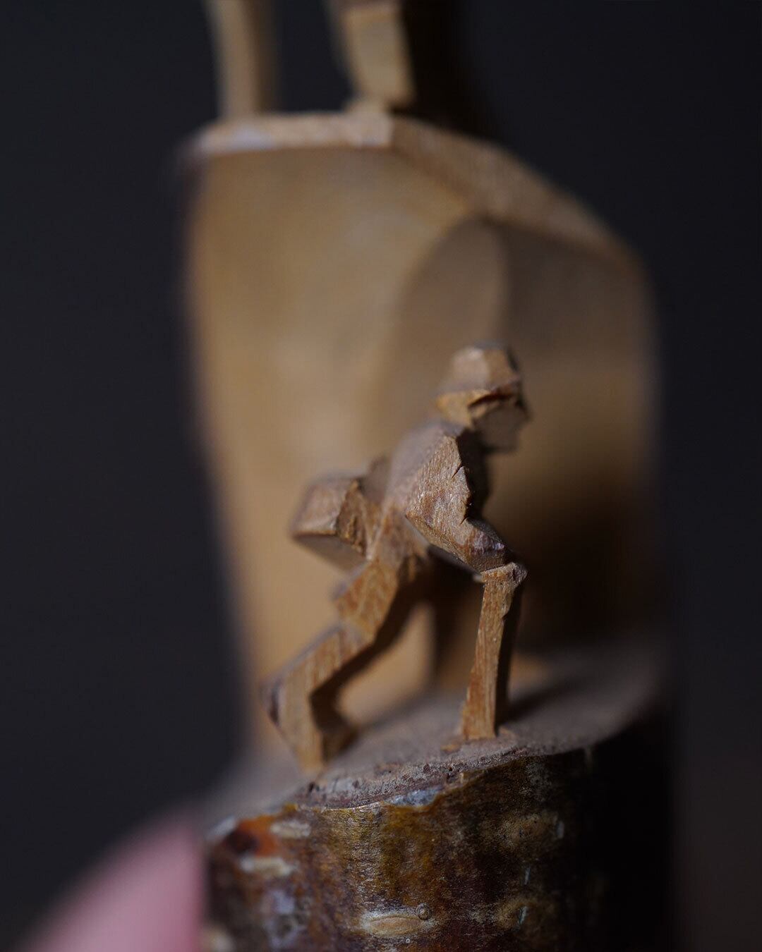 こっぱ(木片)を生かし、二人の登山者を彫り出した、希少な極小サイズの登山人形です。