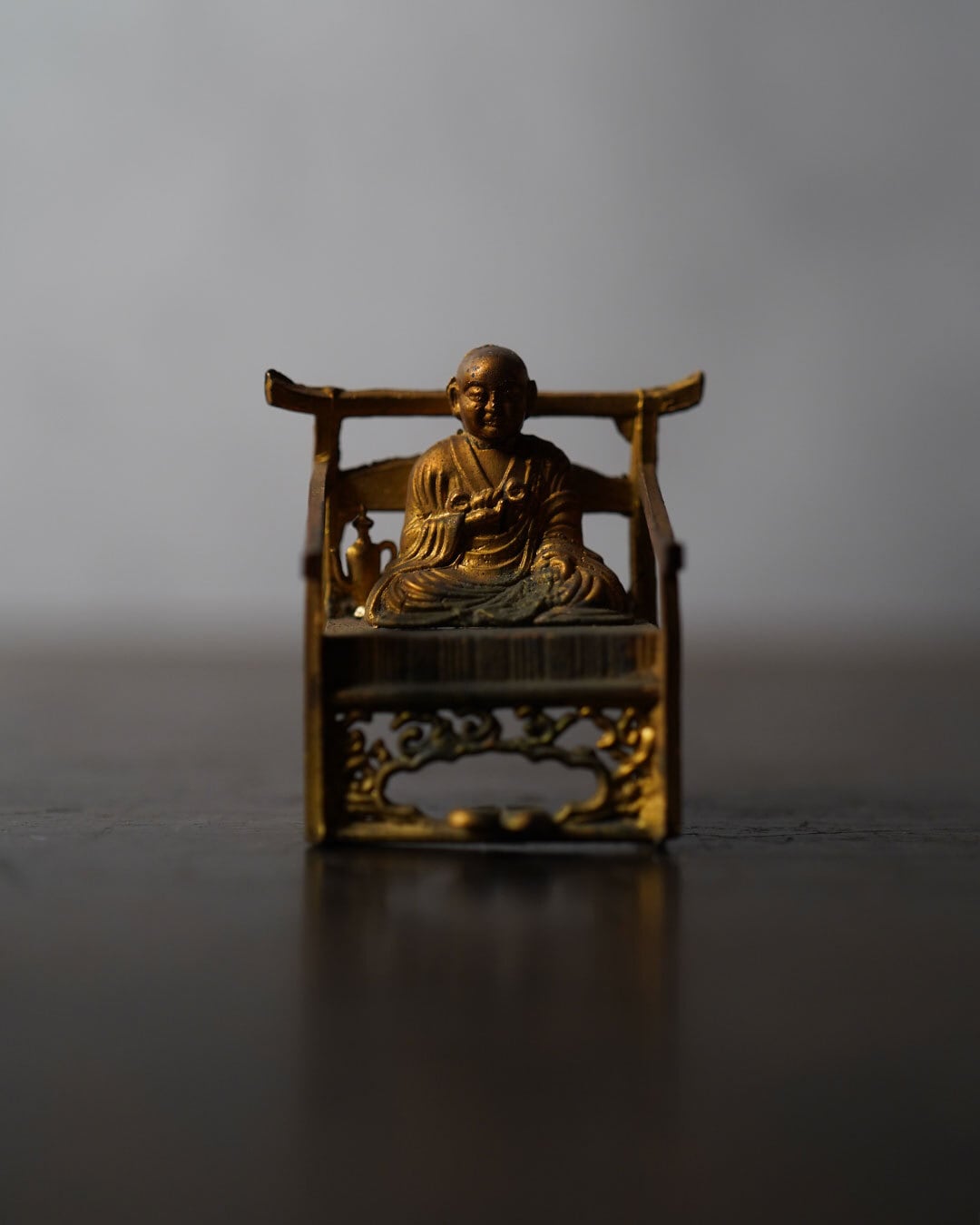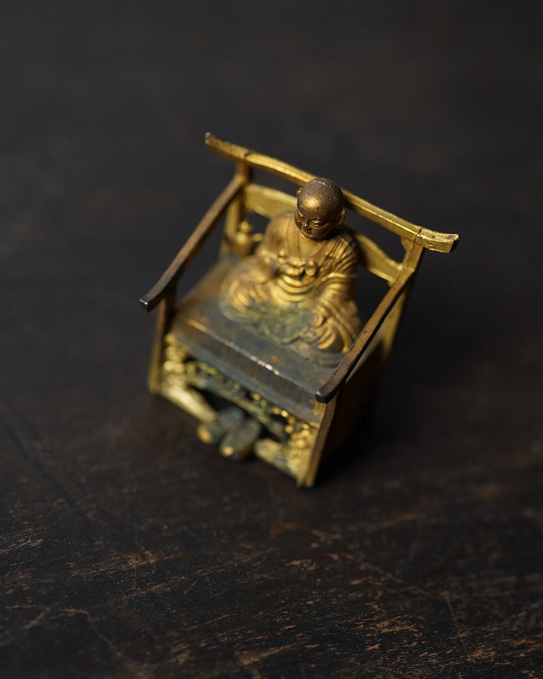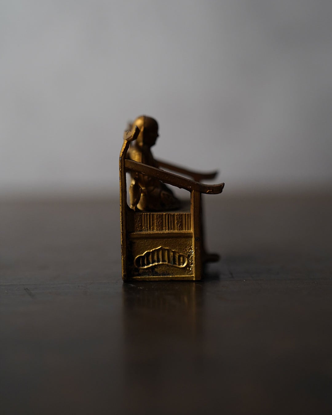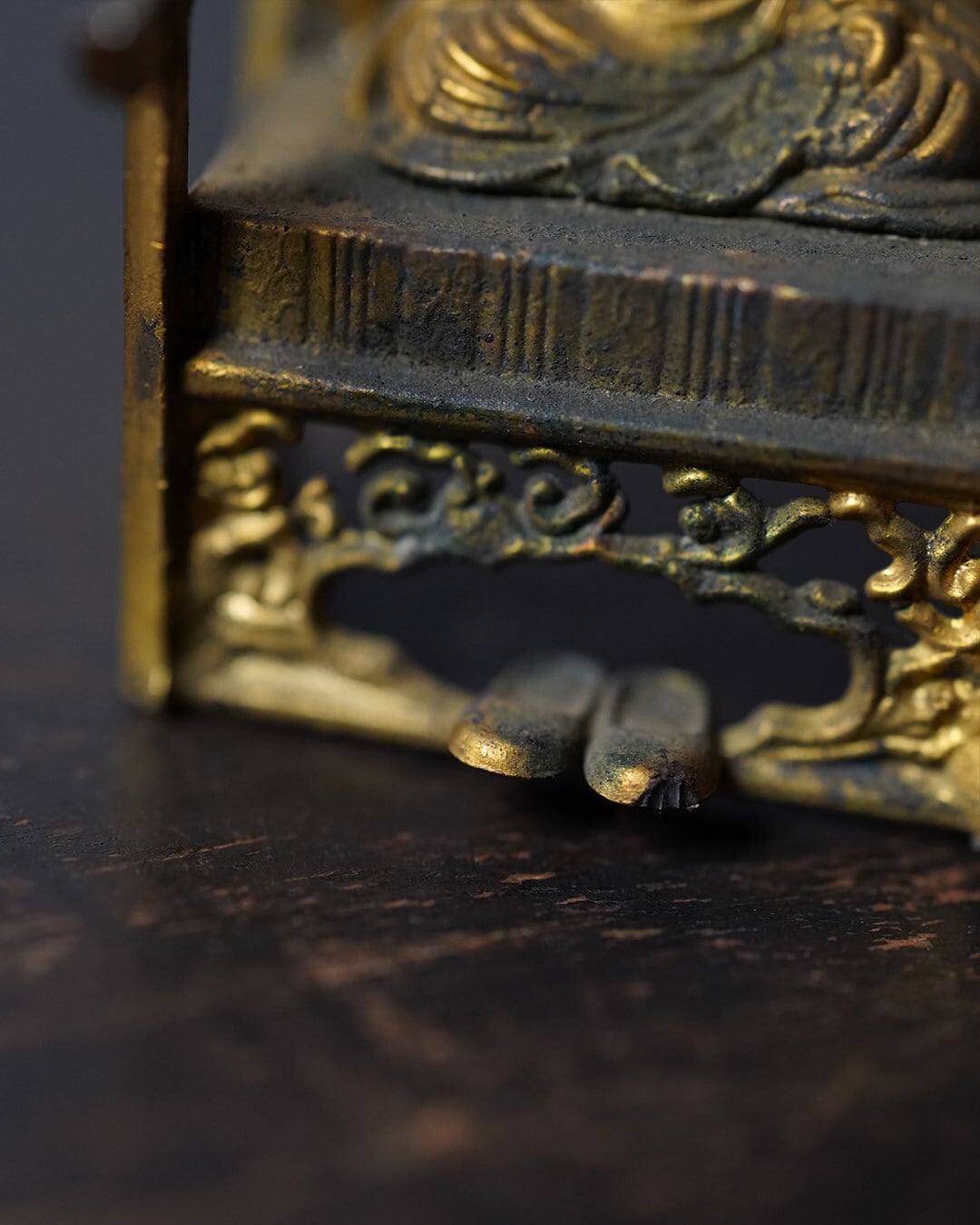 小像ながら、衣の襞や牀座の装飾、柔らかな表情など細部まで丁寧に表されており、落ち着いた気品が感じられます。金属表面には経年によるくすみや色の変化が見られ、古い金属ならではの味わい深い景色を帯びています。