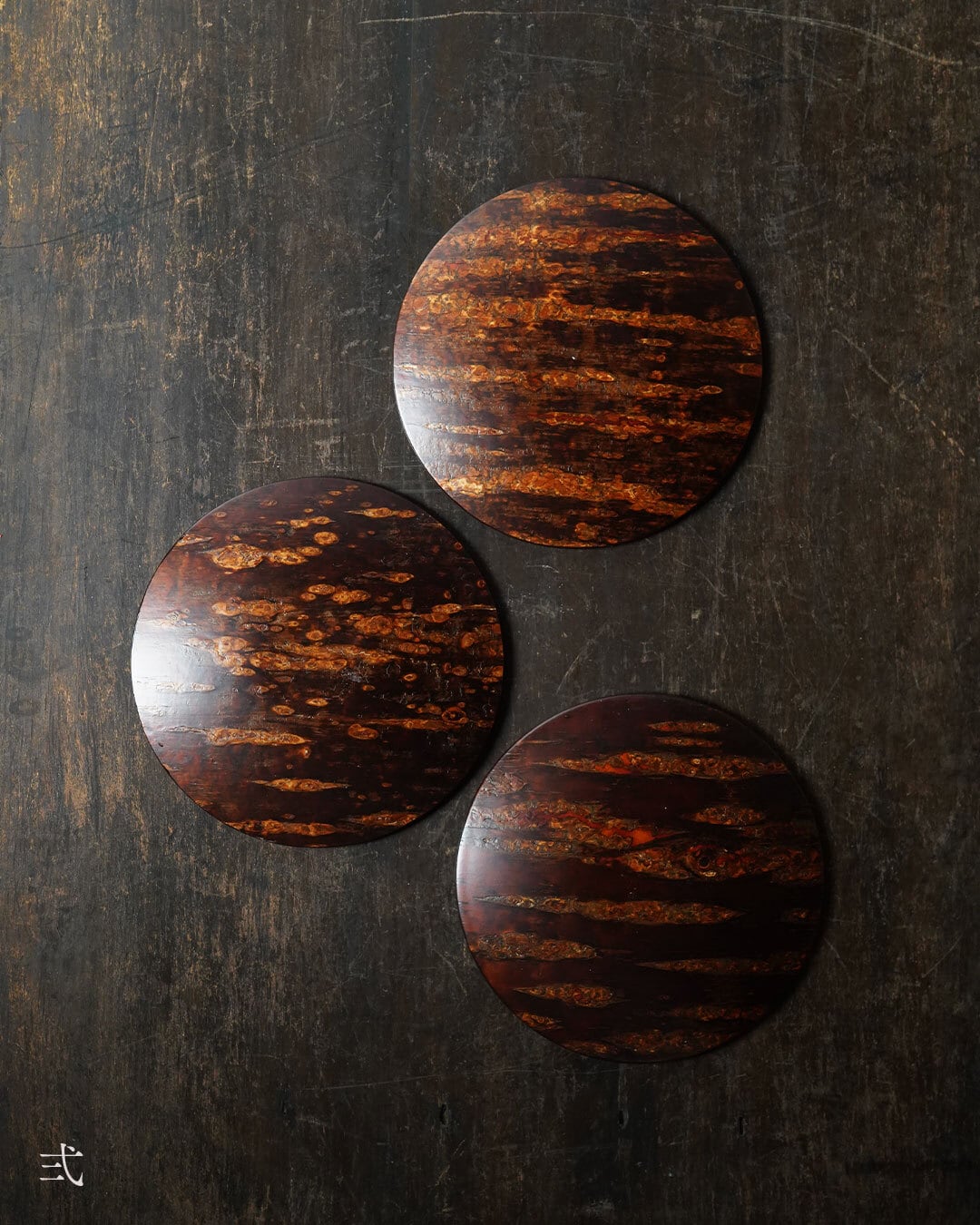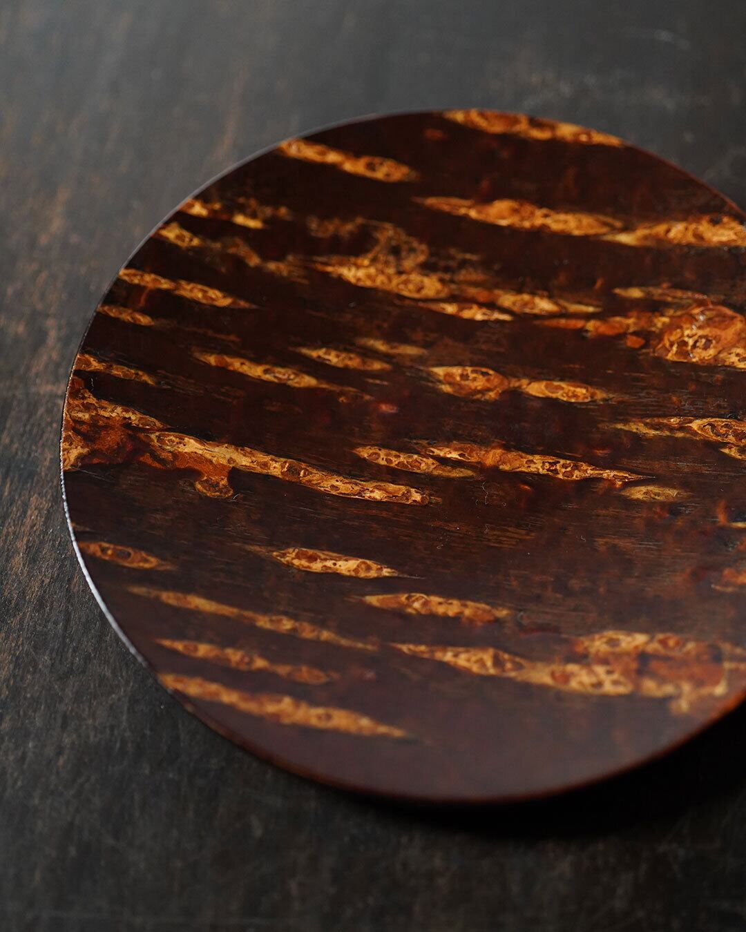 秋田の伝統的工芸品・樺細工(桜皮細工)による、丸形の銘々皿です。