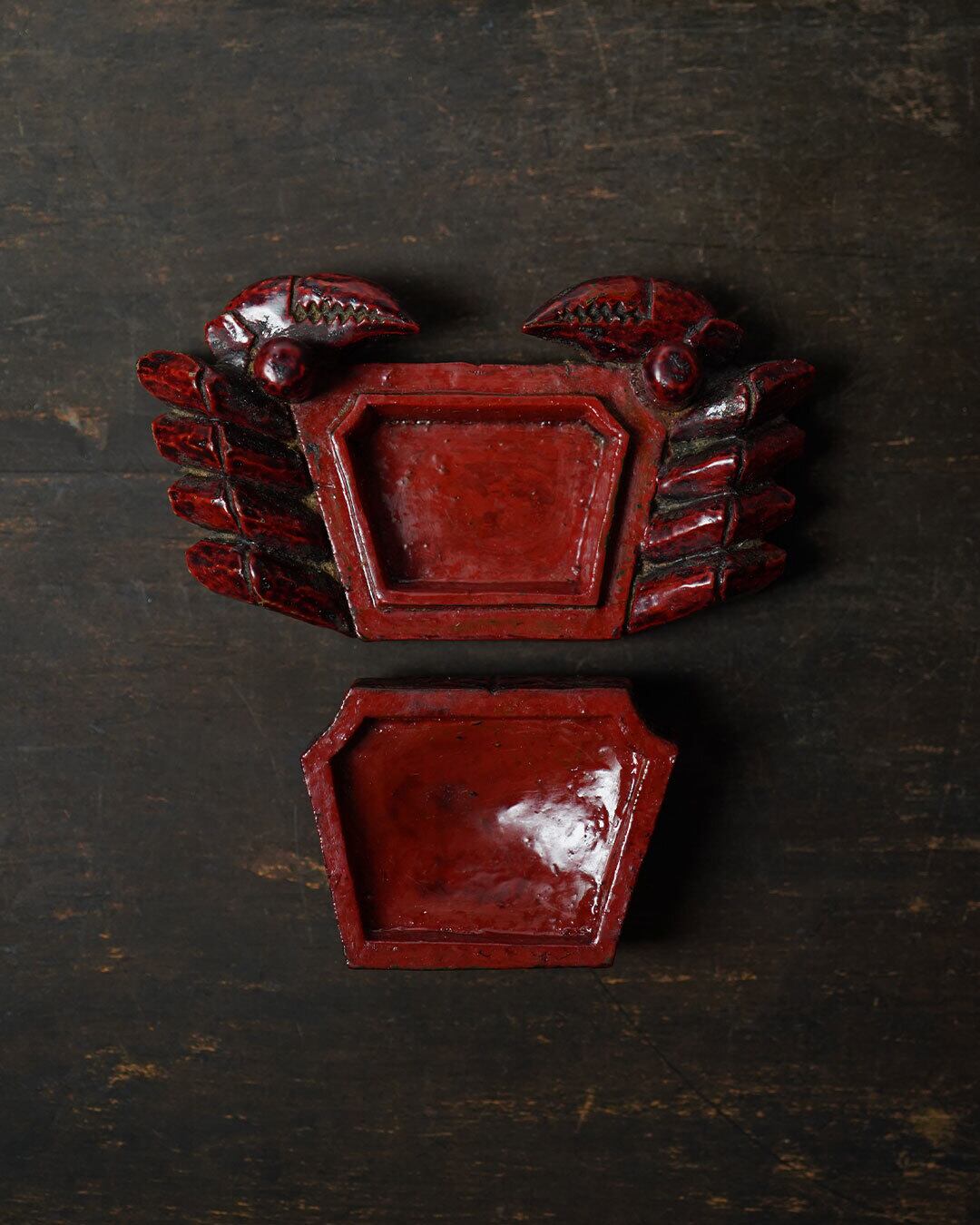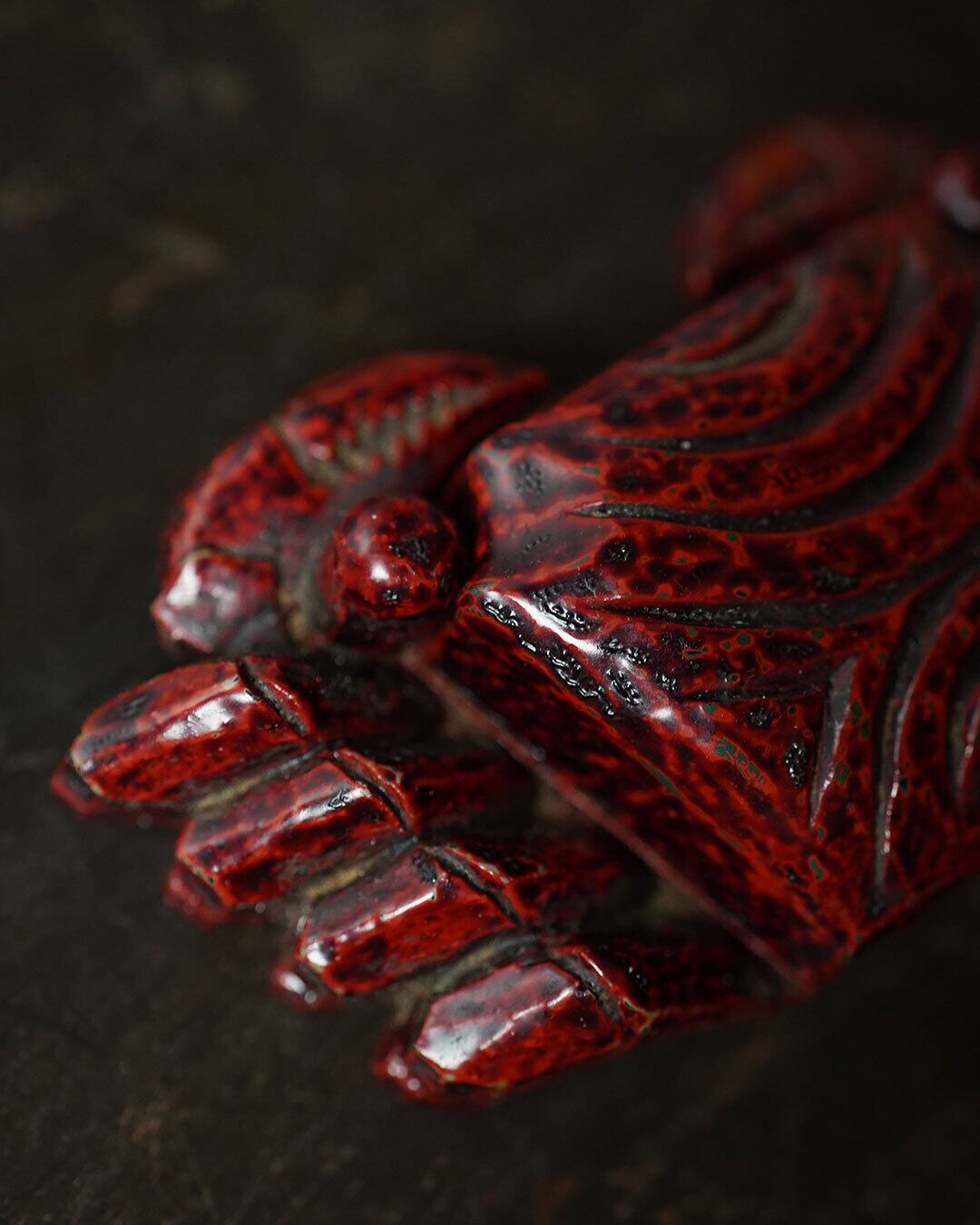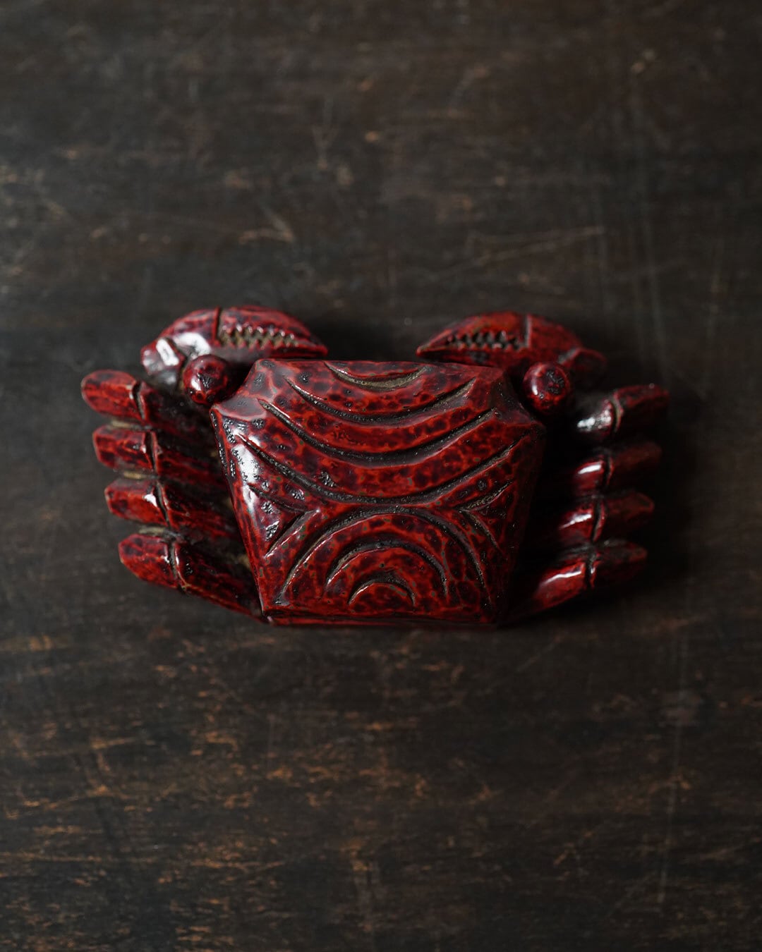 表面には深い朱漆調の塗りが施され、まだら模様が味わい深い景色をつくっています。塗りの揺らぎが生む表情に加え、甲羅や腹面に刻まれた彫り模様も印象的で、装飾的な面白さを感じさせます。どこか愛嬌のある佇まいも、この品の魅力のひとつです。手のひらほどの小さな品ながら、確かな存在感を感じさせます。