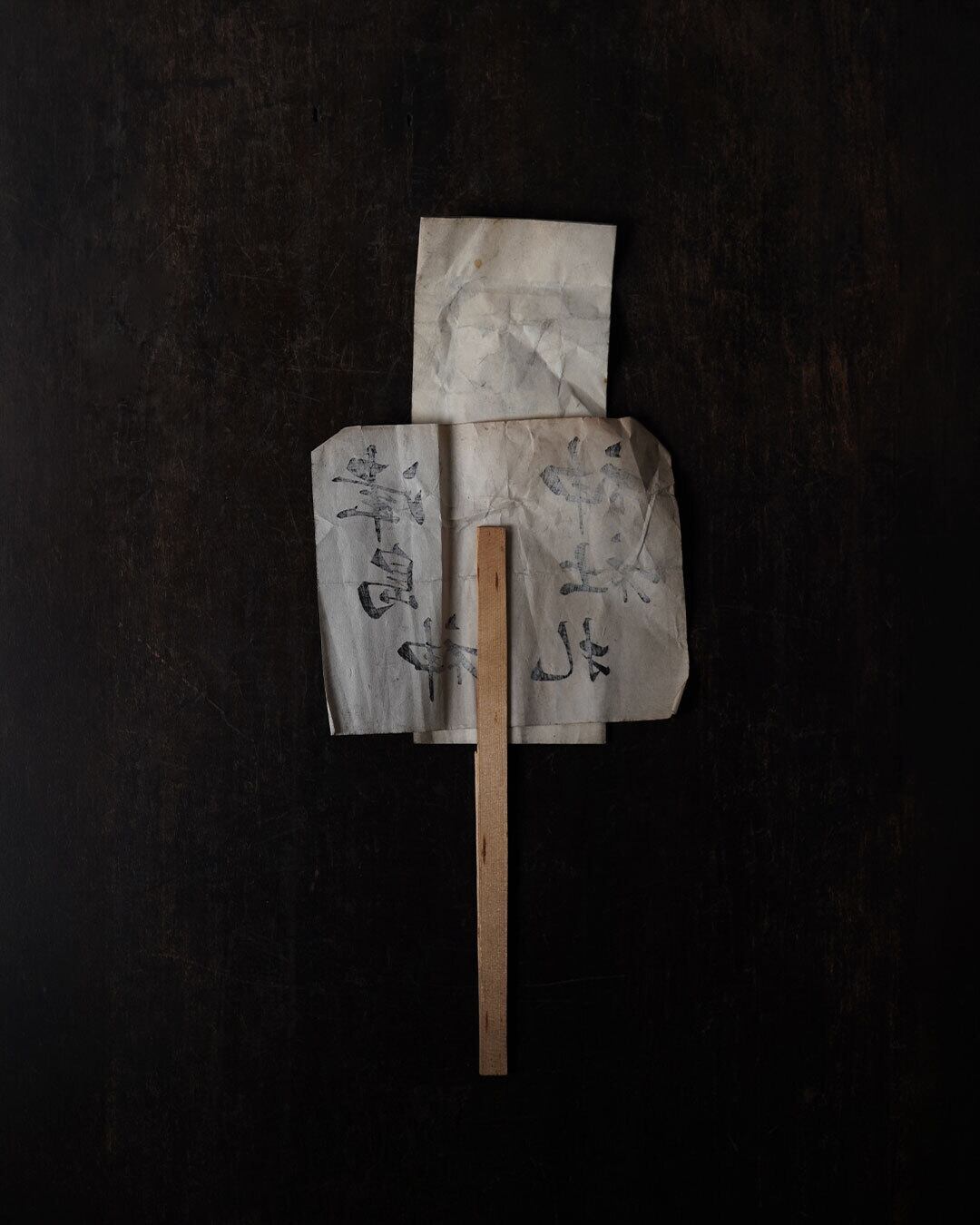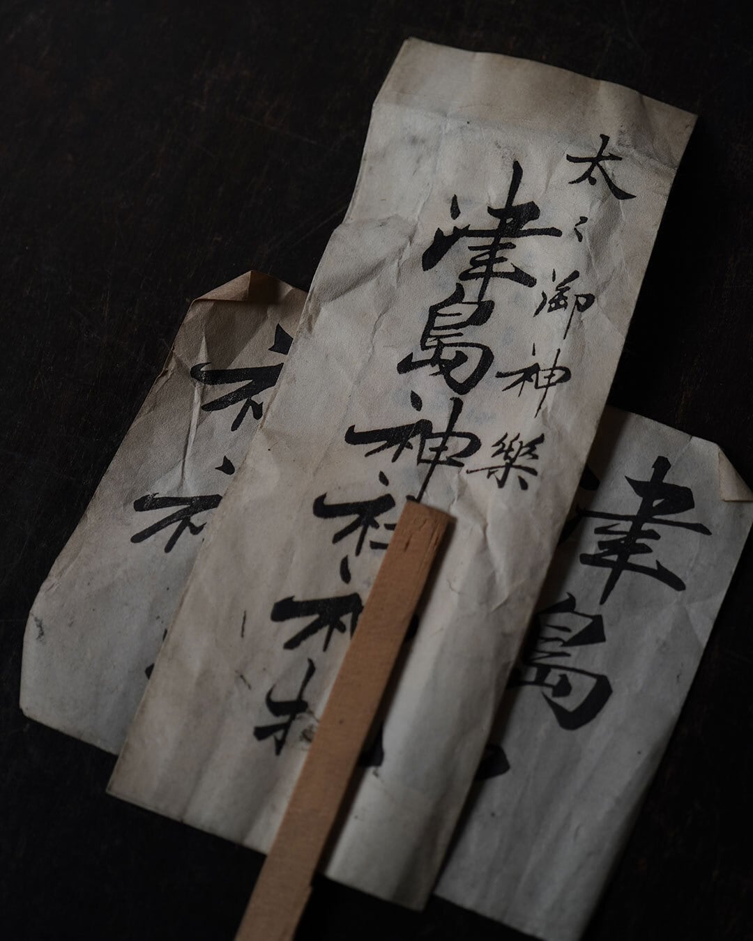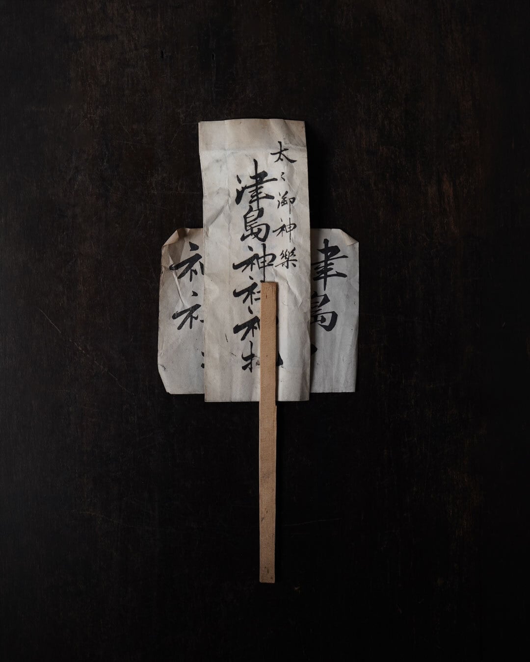 “たぐち札”と呼ばれる、豊作を祈って田の水口や畦道に立てて用いられた御神札です。本品は札が二枚重なった状態で残されており、「太々御神楽」の記載が見られ、神楽奉納に関わる祈願札であったことがうかがえます。