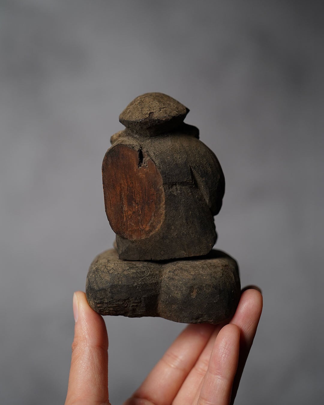 俵に差し込む仕様で、背に本来備わっていた袋と右手を欠いていますが、その簡潔な姿にもまた、長い時の経過が静かに刻まれています。明治期頃の作と推定され、百年余の時を経た一体です。