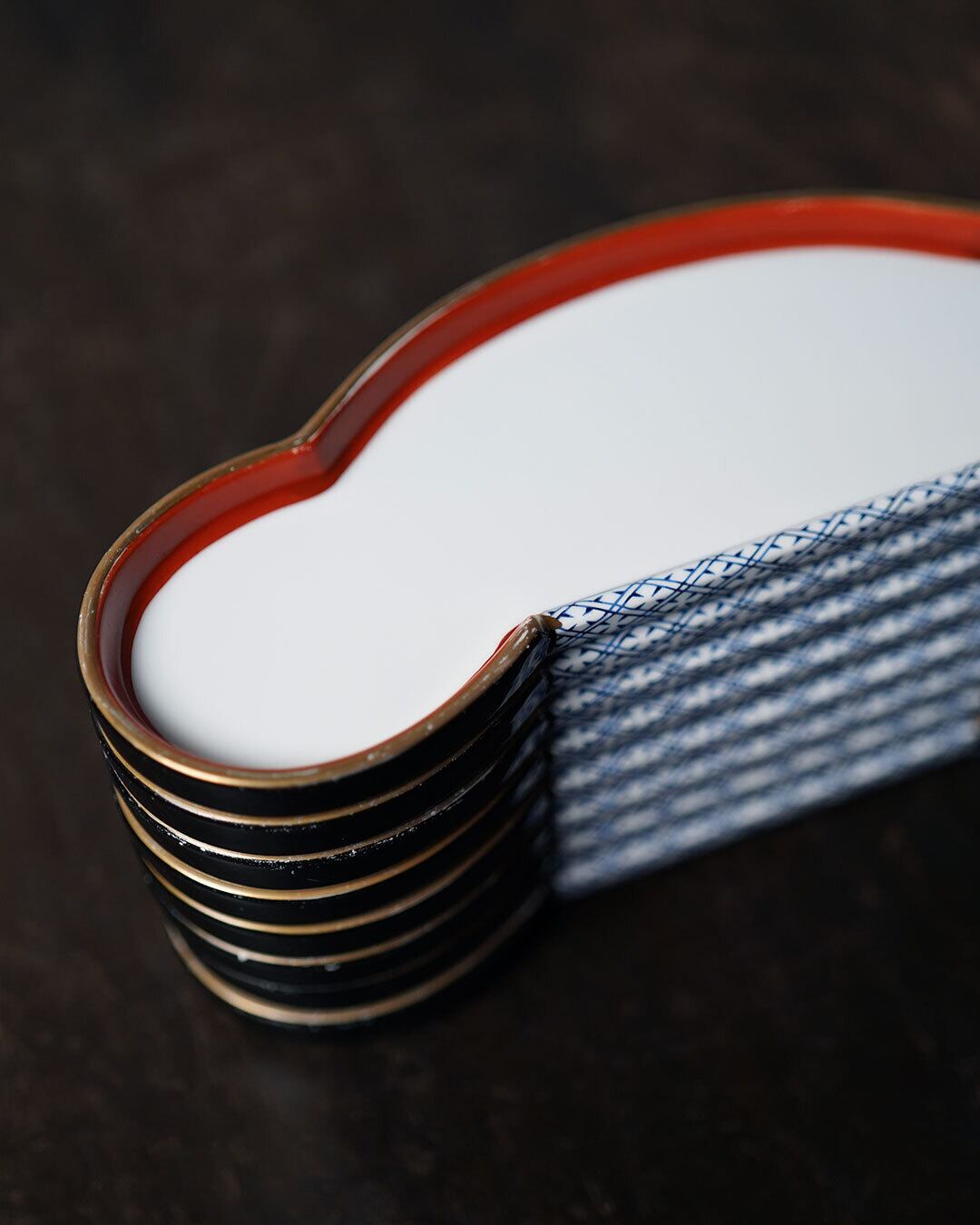 見込みは白磁の余白を広くとり、縁には朱と金彩を重ねた華やかな縁取り。その外側を黒釉が引き締めることで、全体に静かな緊張感と奥行きが生まれています。側面には細やかな幾何文が巡らされ、簡潔な構成の中に九谷らしい端正な意匠が感じられます。高台を備えることで、重ねた際の収まりも美しく、揃いとしての佇まいにも魅力があります。